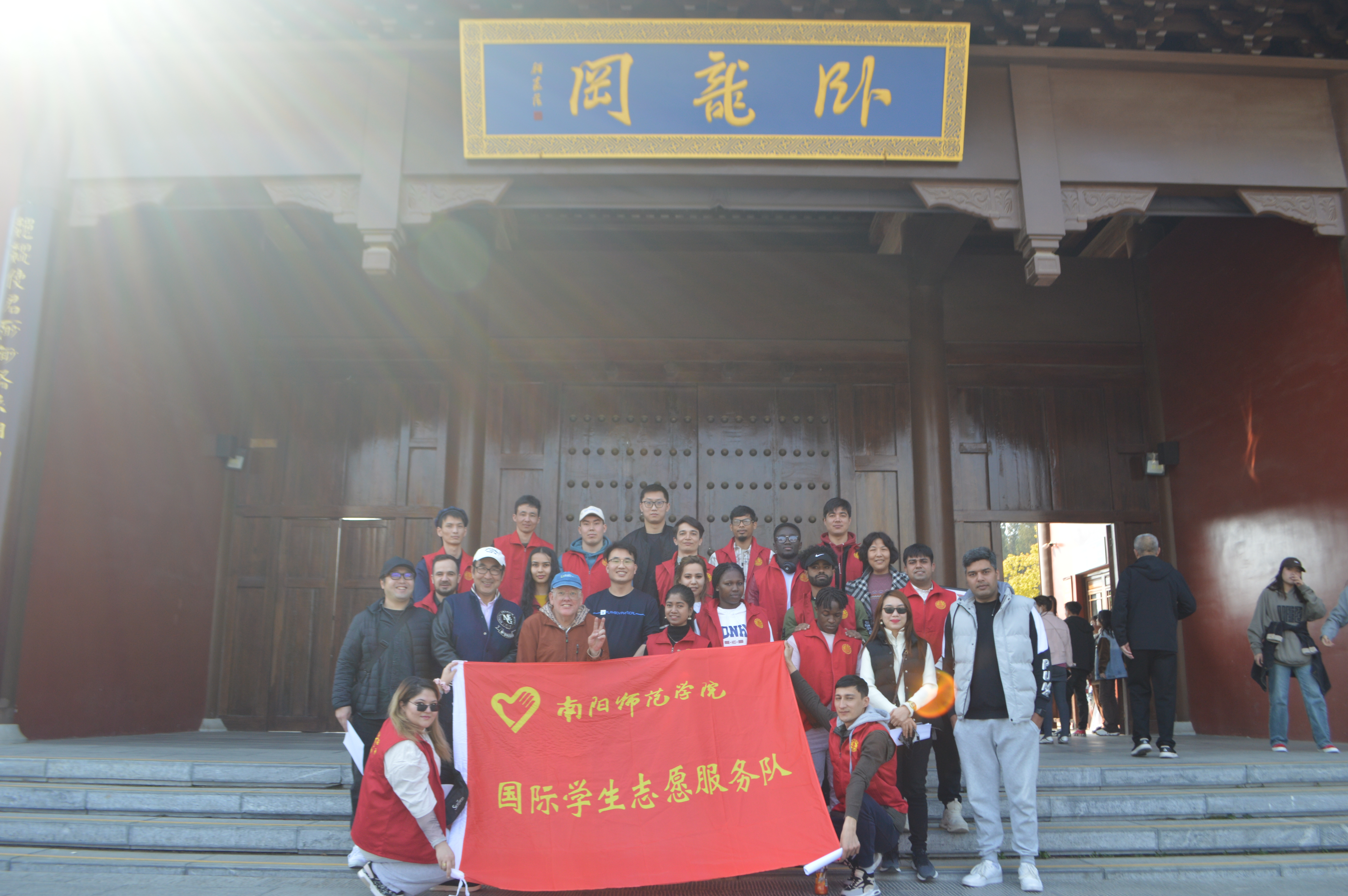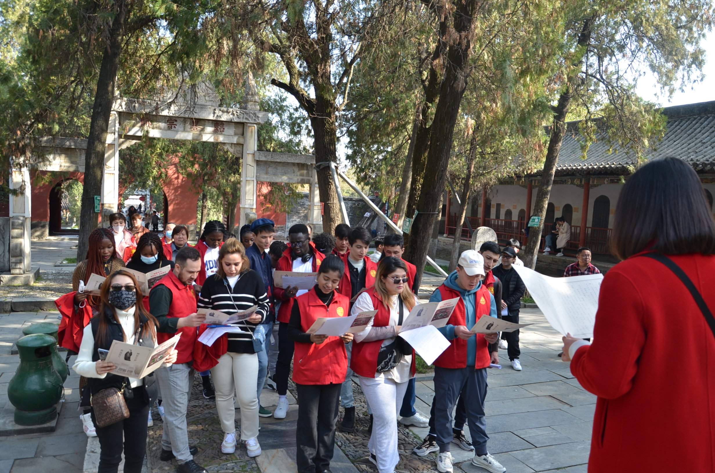 诸葛草庐前,志愿者们和广大游客一起学习“学雷锋纪念日”的来源、朗诵雷锋语录,发放《文明旅游倡议书》,并对草庐等古建筑进行清洁打扫,以实际行动践行雷锋精神。随后,外籍师生志愿者们跟随讲解员,聆听诸葛亮的故事,齐诵诸葛亮《出师表》,了解中国传统优秀文化,感受中华文明的源远流长。