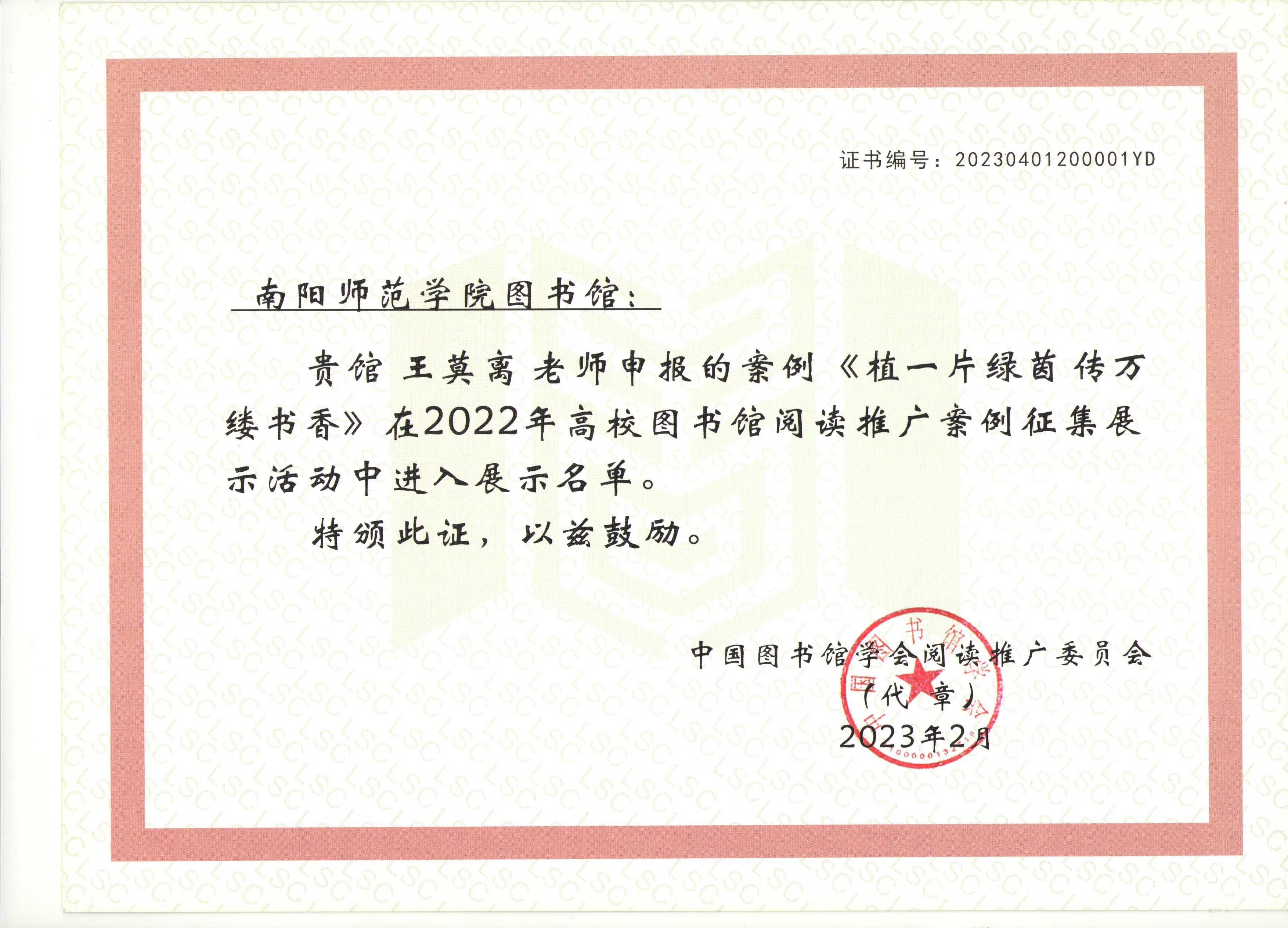 本网讯(通讯员 王莫离 林坤)近日,从中国图书馆学会传来喜讯,新葡萄官网图书馆副研究馆员王莫离主持申报的阅读推广案例《植一片绿茵 传万缕书香》在全国高校阅读推广案例大赛中获奖。