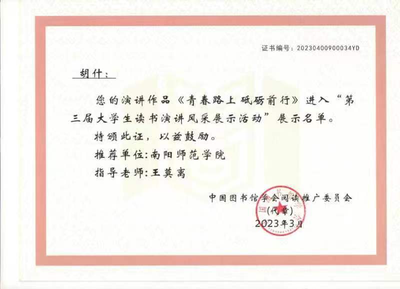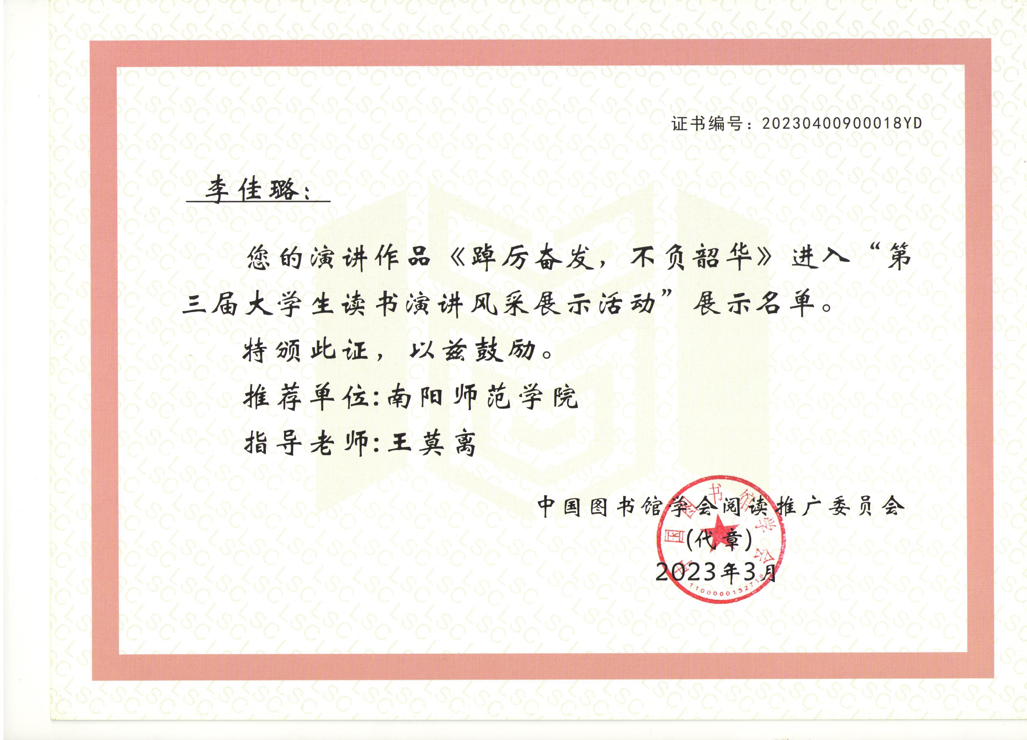 本网讯(通讯员 王莫离)近日,在中国图书馆学会主办的第三届全国大学生读书演讲风采展示活动中,新葡萄官网参赛选手胡什、李佳璐过关斩将,入选展示名单,图书馆王莫离老师荣获优秀指导老师奖。