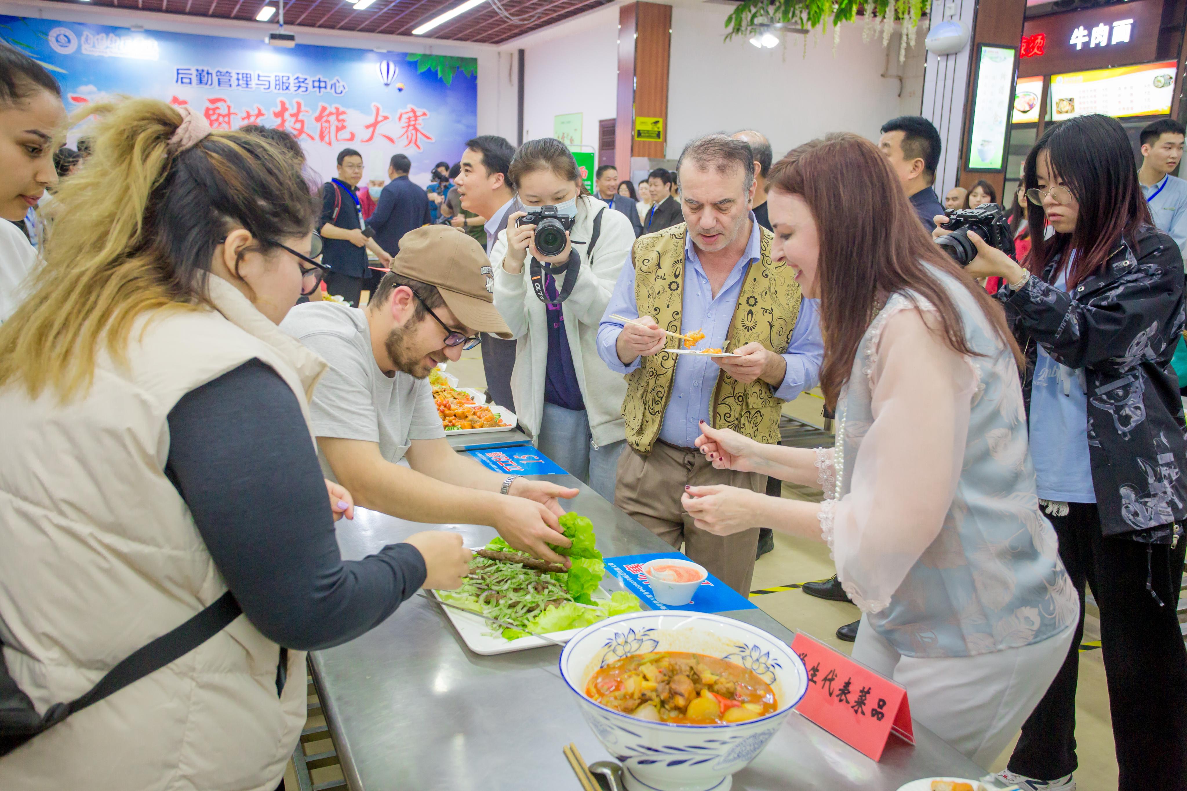 大赛现场还邀请少数民族师生代表制作家乡传统美食与大家分享,食堂厨师代表为大家带来了“洁白如雪、细若银针”的拉面表演。
