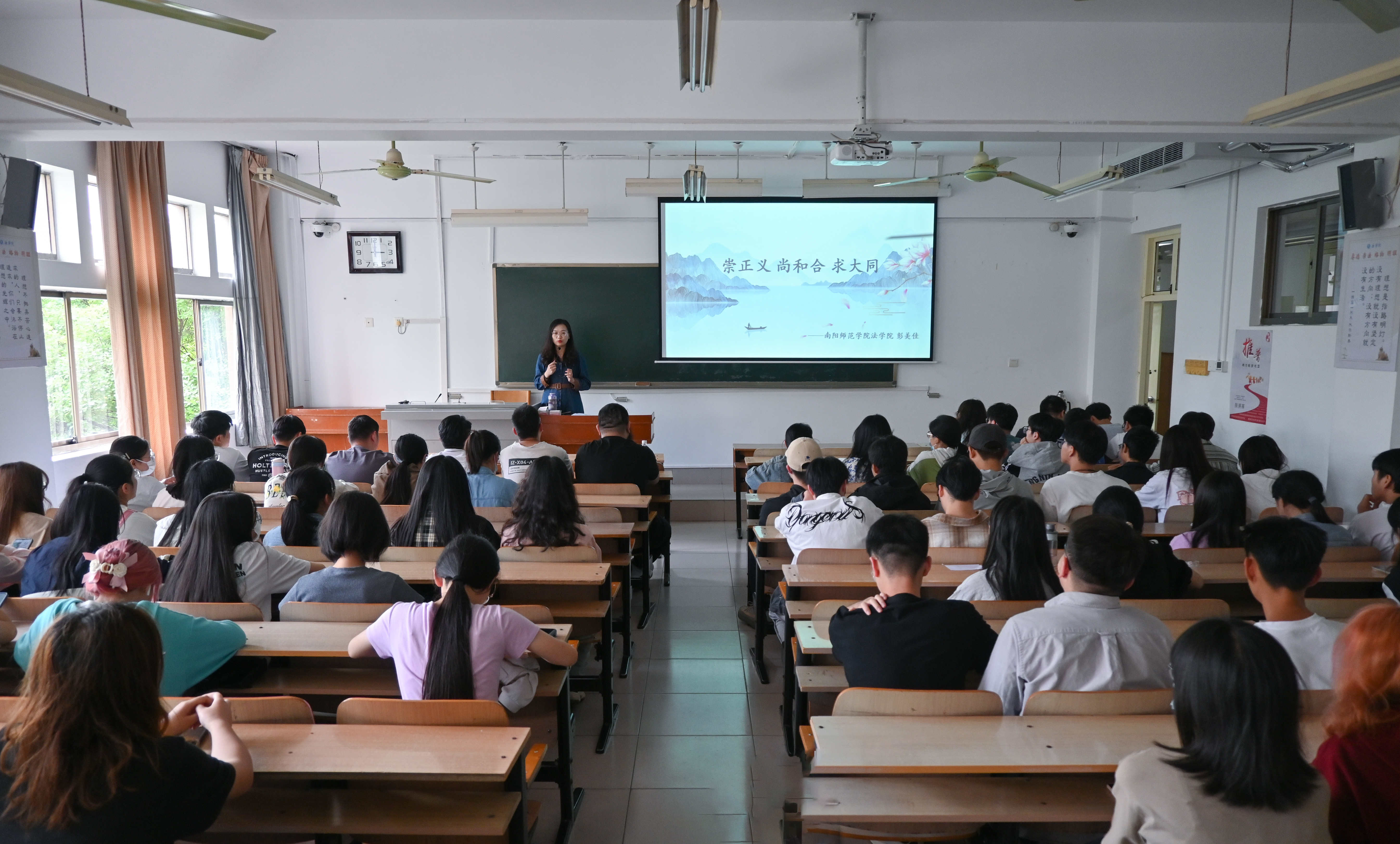 本网讯(陈欣 董嘉怡/文 郑宇棋/图)5月24日下午,新葡萄官网以“崇正义尚和合求大同”为主题的第202期道德讲堂在逸夫楼N206教室举行。本次活动由法学院彭美佳老师担任主讲,该院2021级学生参加。