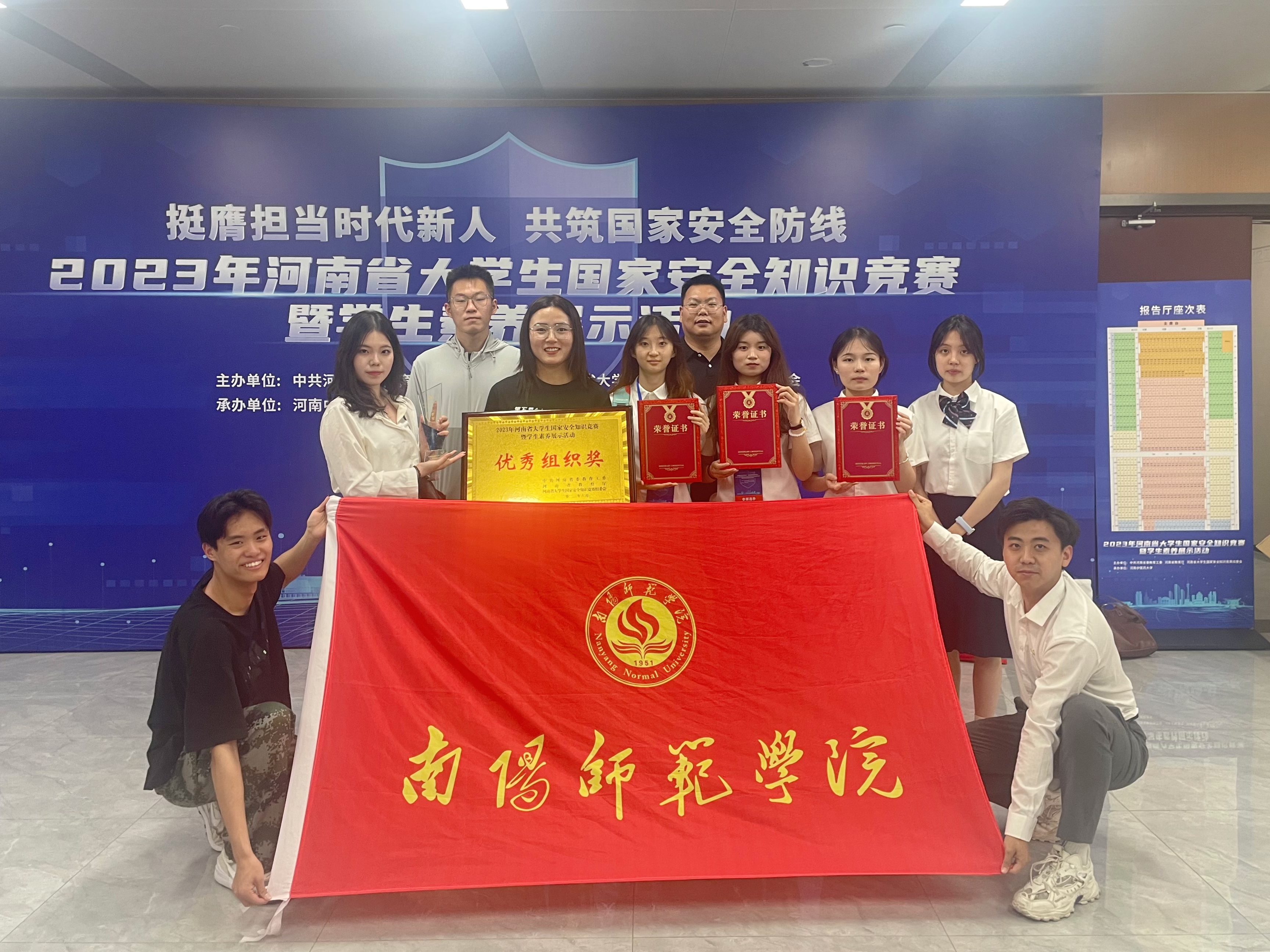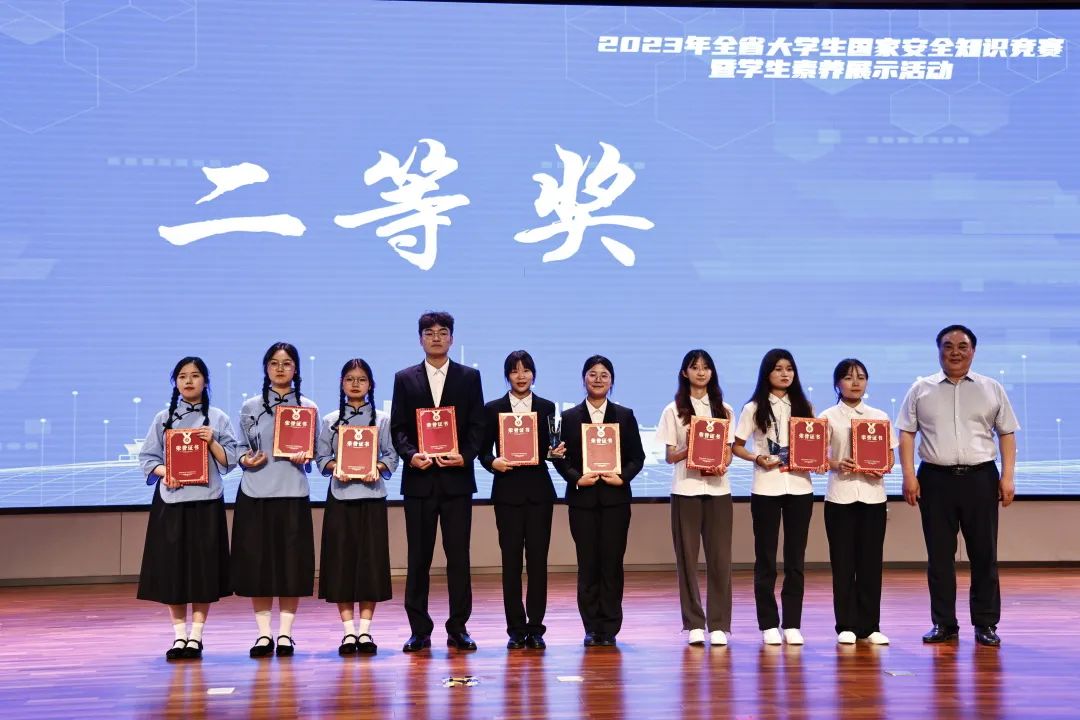 本网讯(通讯员 陈欣)6月9日,2023年全省大学生国家安全知识竞赛暨学生素养展示活动现场决赛在河南中医药大学举办。省委教育工委、省教育厅二级巡视员黄才华,省委教育工委、省教育厅思政处处长陈凯出席。由新葡萄官网薛江谋老师领队,陈欣、田裕心为指导老师,连李想、田慧琳、李佳艺、刘湘雯、刘佳琦、周浩等六位同学组成的新葡萄官网代表队经现场答题、素养展示环节比拼,最终以全省第2名的成绩荣获二等奖、优秀组织奖。