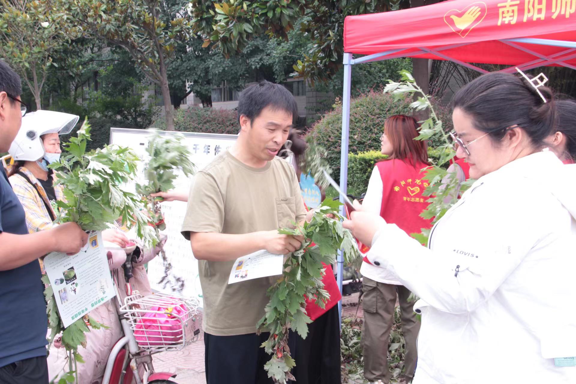 生命科学与农业工程学院副院长焦铸锦向参与活动的师生们介绍艾草的生物学特性。艾草开发利用工程技术研究中心周索、杨树琼、王鹏老师分别从艾草的活性成分、生物学功能、开发利用等方面向大家科普艾草的基础知识、艾产品的正确使用方法。农学专业的志愿者们也给师生们准备了新鲜艾草、艾草足浴包、艾柱等小礼品,并向大家详细讲解使用方法。大家纷纷表示会力所能及地弘扬中医药文化,宣传推介“南阳艾”产品。(编审 刘潇潇)