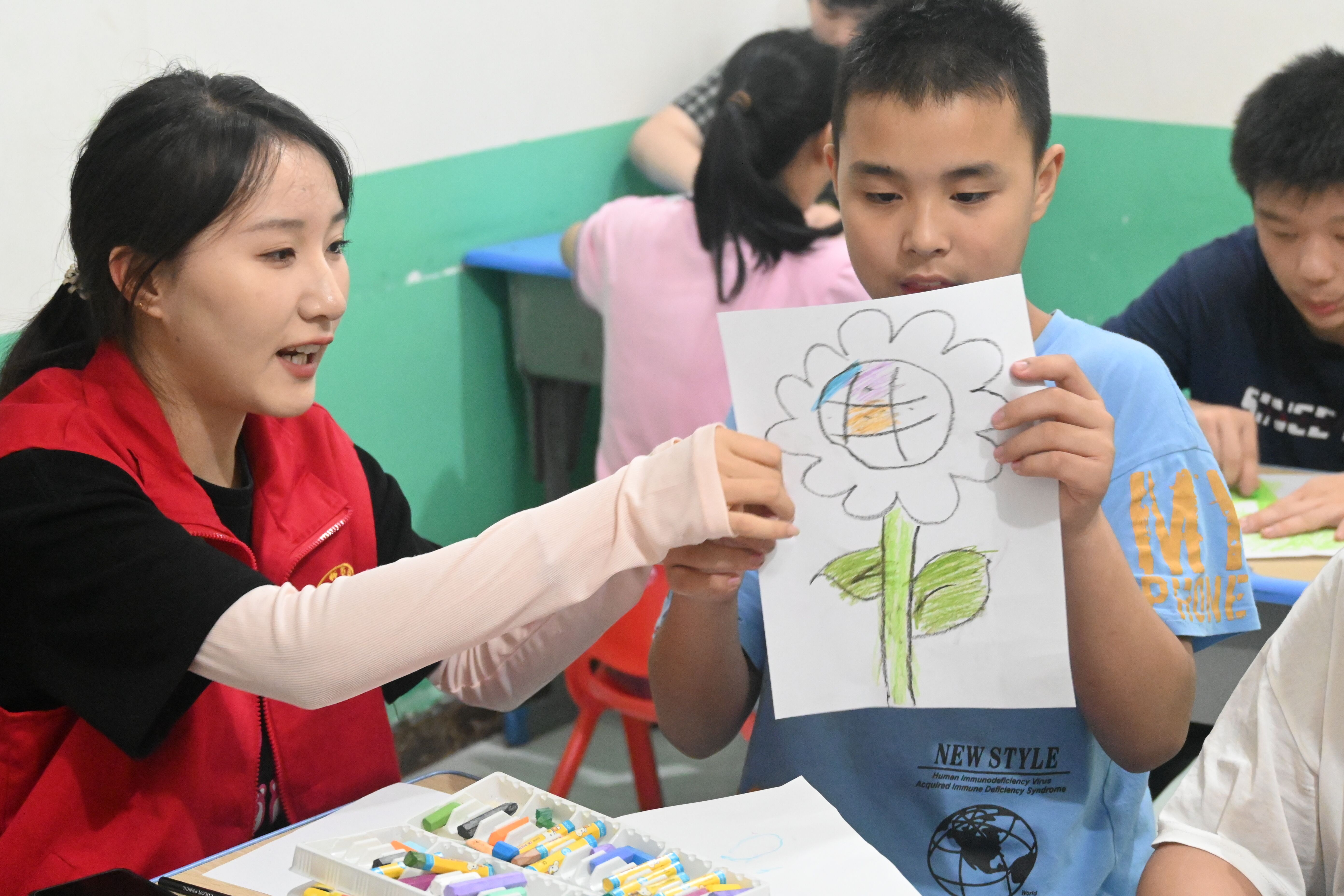 6月27日,教育科学学院“雨润童心”志愿服务队走进南阳市潜能教育培训学校开展“蓝色行动,爱不孤独”暑期社会实践活动。志愿者们在校长的讲解下了解到与自闭症儿童相处的注意事项,基本熟悉了不同班级学生个人能力及认知发展水平的差异,与老师积极配合,帮助孩子们开展手工课程,一起绘画涂色,传递爱与温暖。