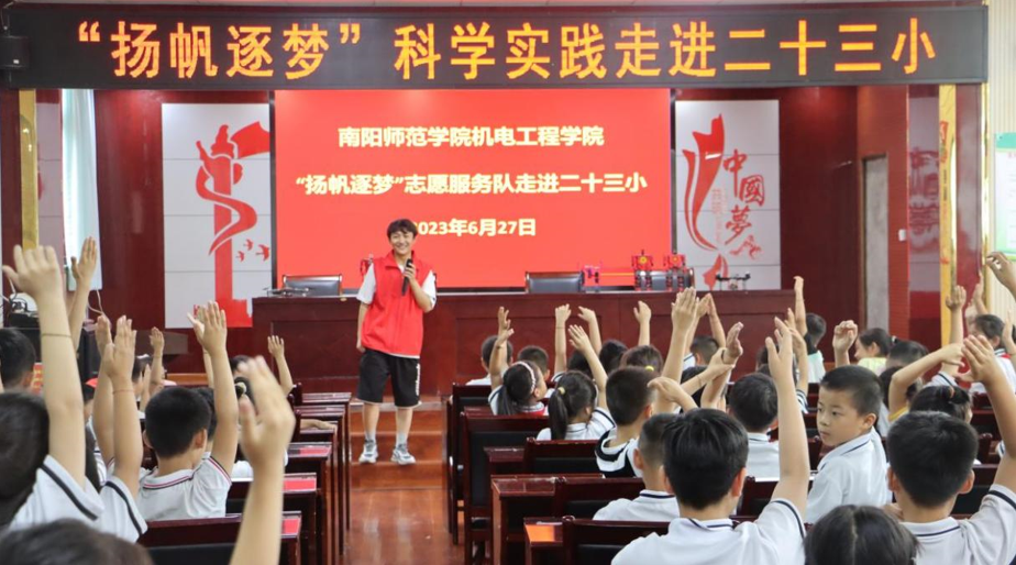 6月27日,机电工程学院“扬帆逐梦”志愿服务队走进南阳市二十三小学组织开展暑期“三下乡”社会实践活动。志愿者们向一、二年级的小学生科普了科技智能方面的相关知识,介绍了机器人的种类、基本构造和工作原理等。通过机器人舞蹈表演、问题抢答等环节,同学们对智能机器人有了更加直观的认识,对科技兴农产生浓厚的兴趣。最后,志愿者们给大家发放橡皮泥粘土,完成机器人玩具制作,锻炼动手能力,培养创新能力,增强团队协作和凝聚力。