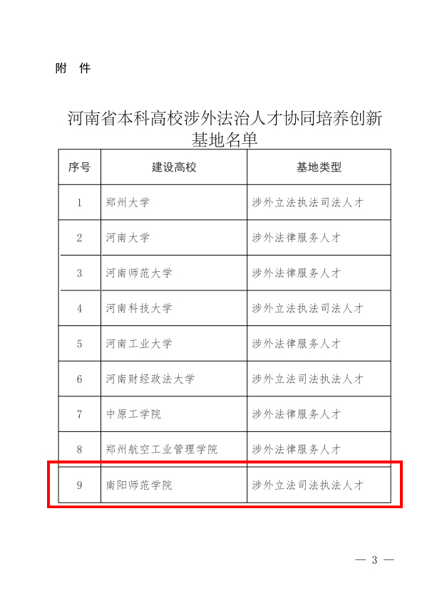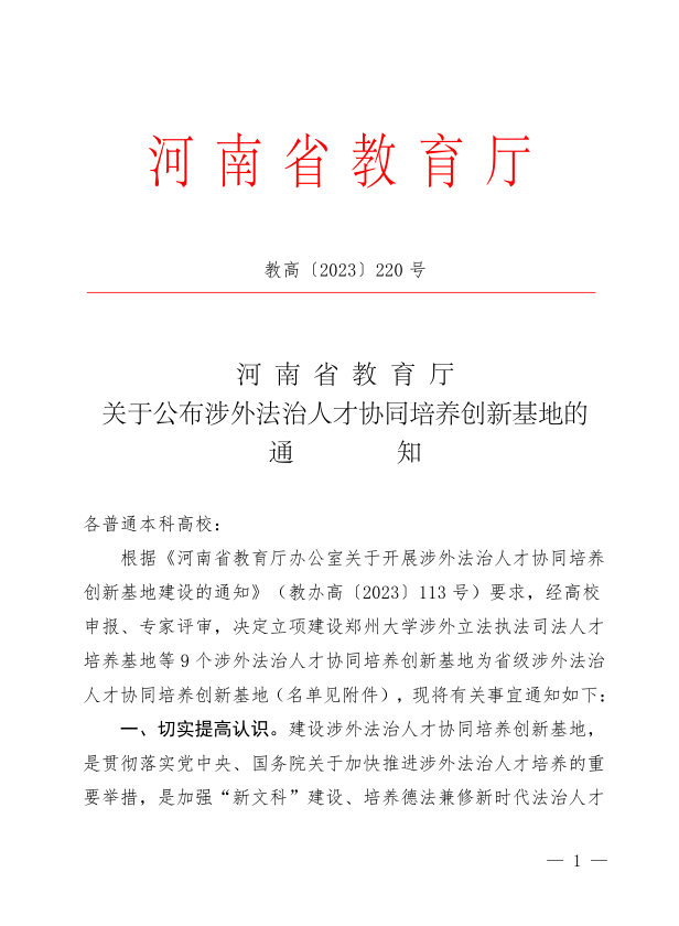 为深入贯彻党的二十大精神和习近平总书记关于加强涉外法治人才培养工作的重要指示,积极落实《教育部关于加快高校涉外法治人才培养的实施意见》等文件精神,河南省教育厅于2023年4月份启动河南省本科高校涉外法治人才协同培养创新基地申报工作。