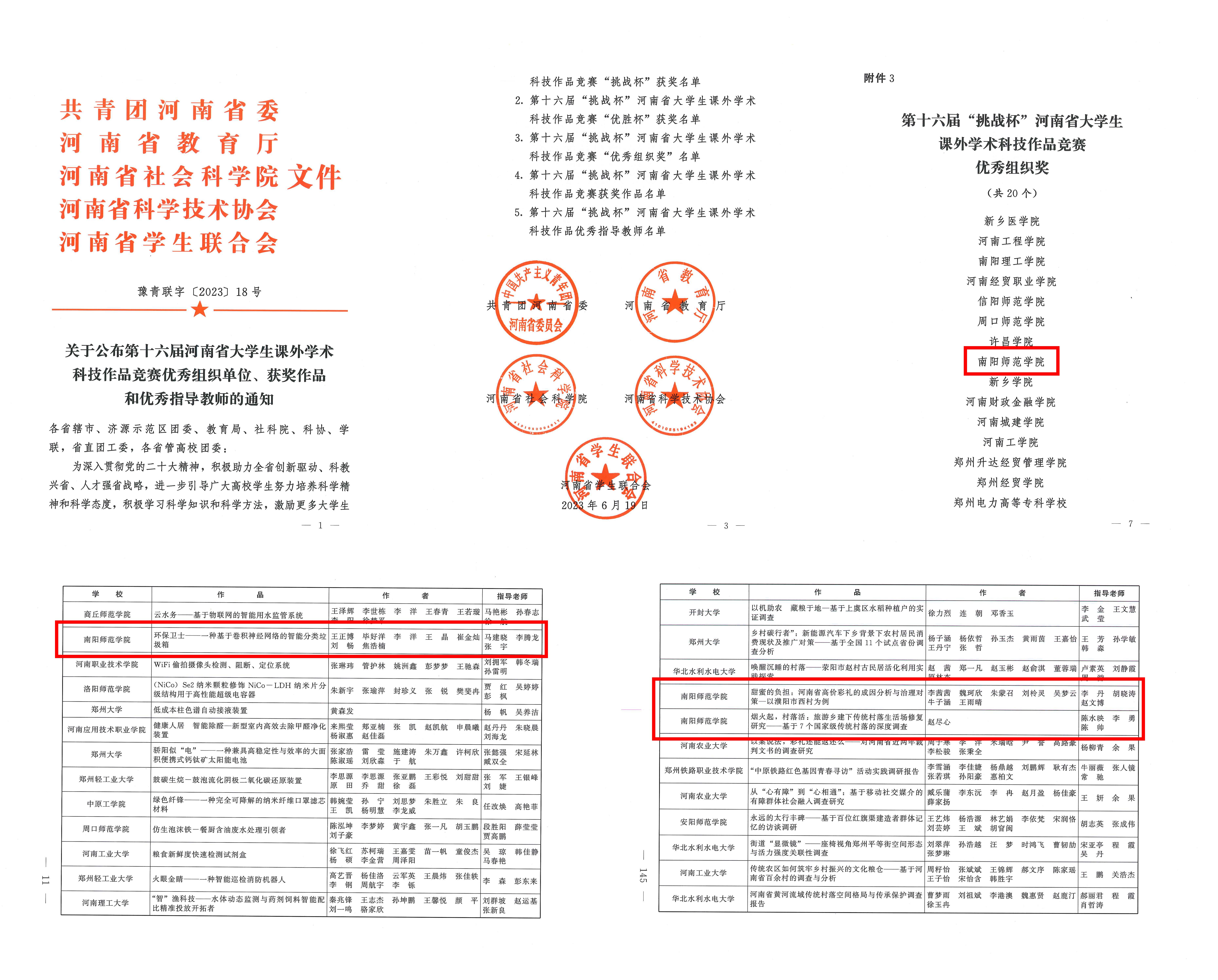 本网讯(通讯员 杨眉 徐艺慈)近日,由共青团河南省委、河南省教育厅、河南省社会科学院、河南省科学技术协会、河南省学生联合会主办的第十六届“挑战杯”河南省大学生课外学术科技作品竞赛获奖名单公布。新葡萄官网获特等奖3项、一等奖3项、二等奖8项、三等奖23项,并荣获“优秀组织奖”。