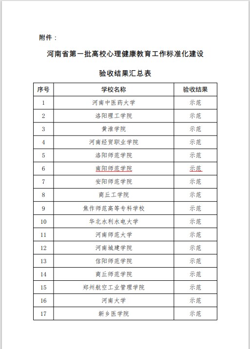 本网讯(通讯员 刘柏涛)日前,中共河南省委教育工委、省教育厅发布《关于公布第一批高校心理健康教育工作标准化建设验收结果的通知》,新葡萄官网荣获“河南省高校心理健康教育工作标准化建设示范学校”称号。