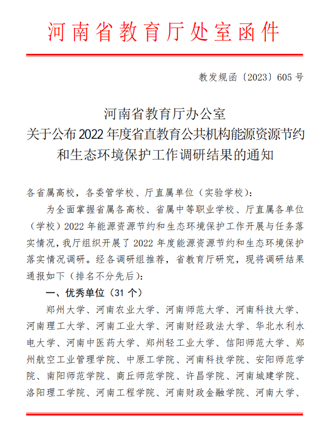 本网讯(通讯员 周鹏)近日,河南省教育厅办公室下发《关于公布2022 年度省直教育公共机构能源资源节约和生态环境保护工作调研结果的通知》(教发规函〔2023〕605 号)文件,新葡萄官网荣获2022年度省直教育公共机构能源资源节约和生态环境保护工作优秀单位。