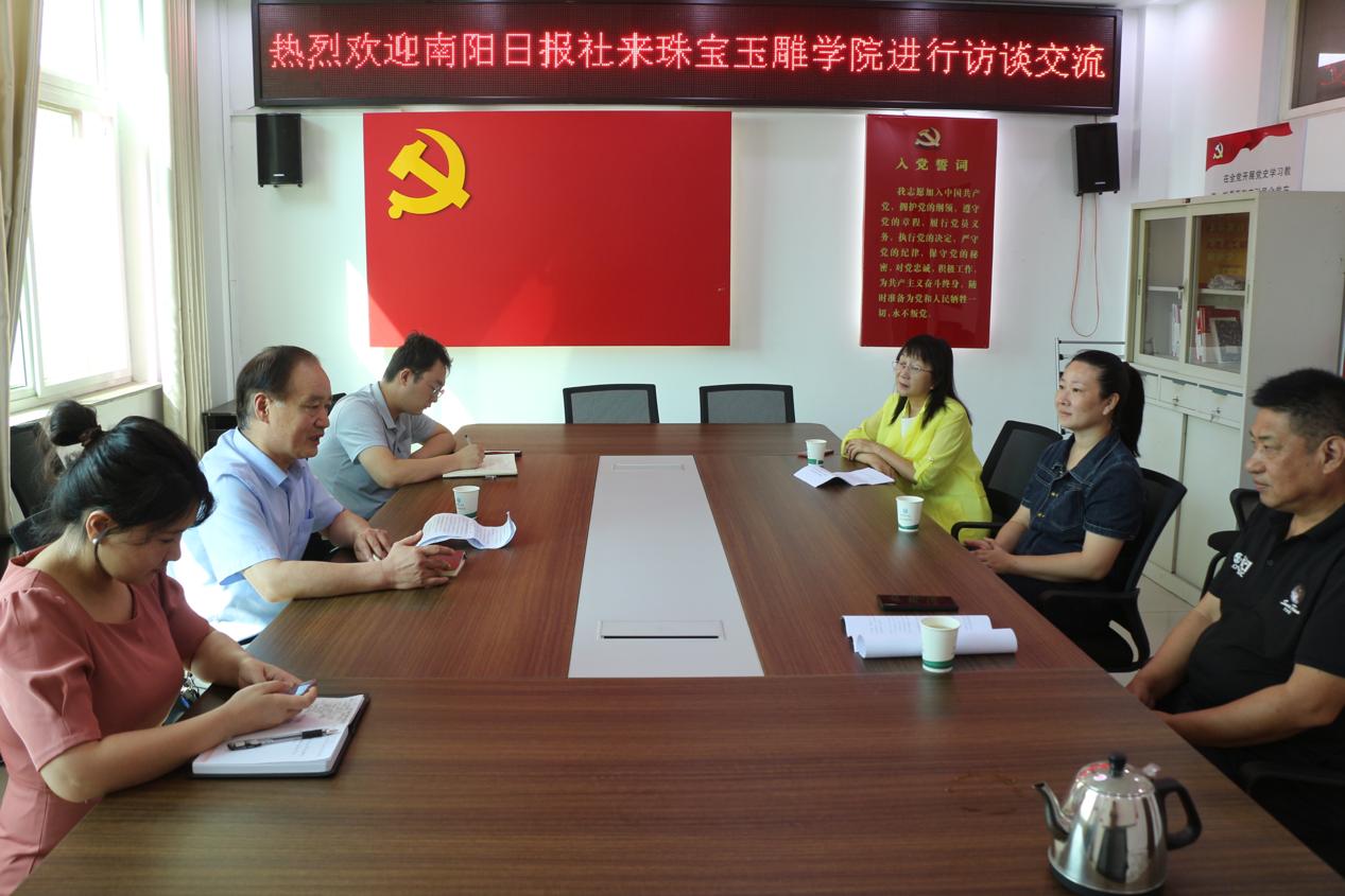 本网讯(余江祥/文 程锦/图)9月15日上午,南阳晚报编辑中心副主编王秀云,南阳日报社教育部主任蔡新国、副主任张进朝,米娜来该院就玉雕行业人才培养问题进行交流座谈。座谈会由珠宝玉雕学院党委书记李春杰主持,辅导员和教师代表参加。