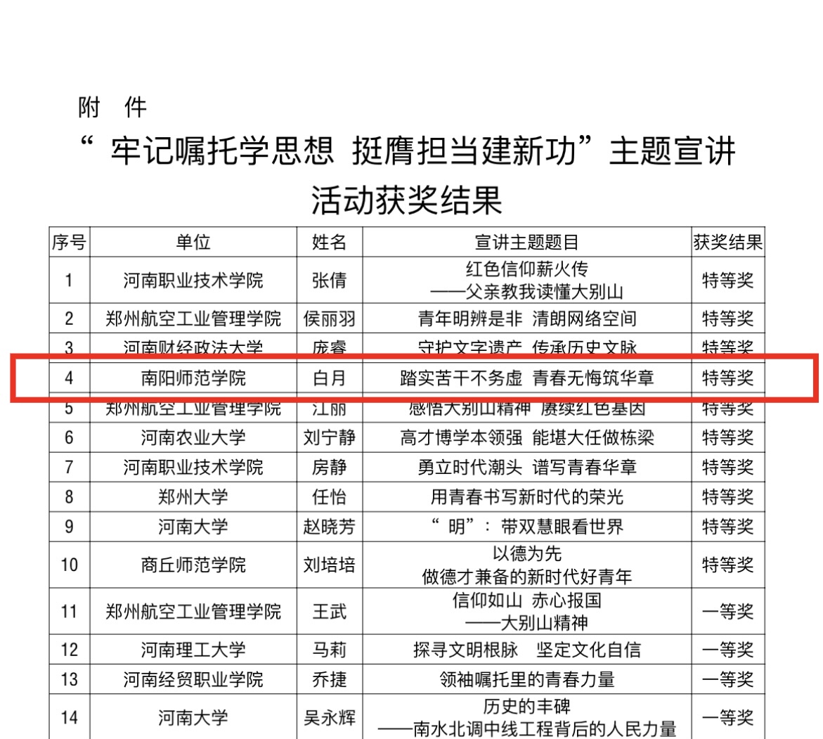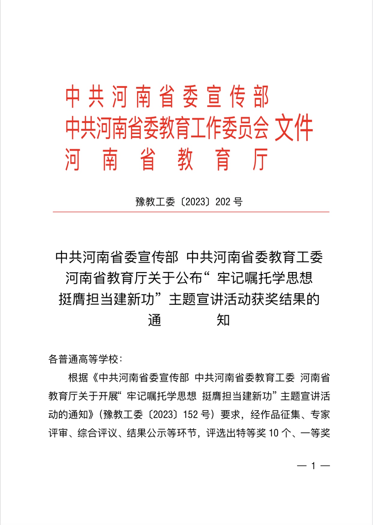 本网讯(通讯员 杨世媛)近日,中共河南省委宣传部、中共河南省委教育工委、河南省教育厅下发了《关于公布“牢记嘱托学思想 挺膺担当建新功”主题宣讲活动获奖结果的通知》(豫教工委〔2023〕202号),新葡萄8883官网AMG获特等奖。