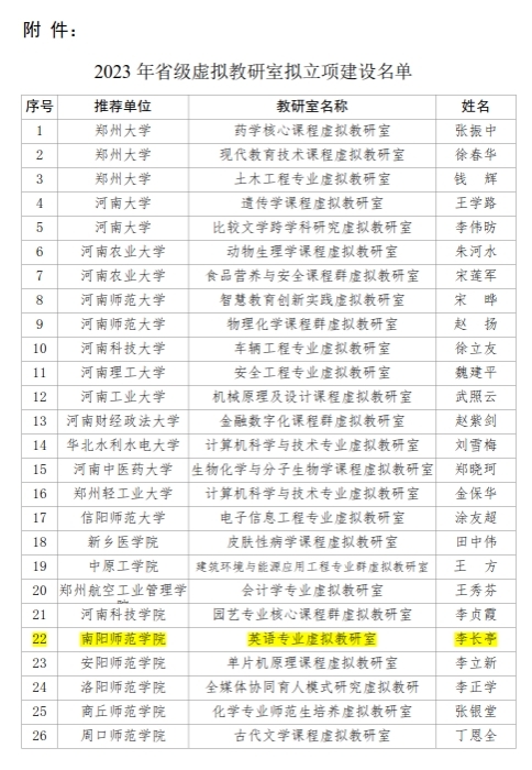 本网讯(通讯员 符贞)日前,河南省教育厅公布了2023年河南省本科高校虚拟教研室名单,新葡萄官网外国语学院李长亭教授作为带头人申报的“英语专业虚拟教研室”获批2023年省级虚拟教研室建设试点,这是继英语专业教研室获得省级优秀教研室以来基层教学组织建设的又一重大突破。