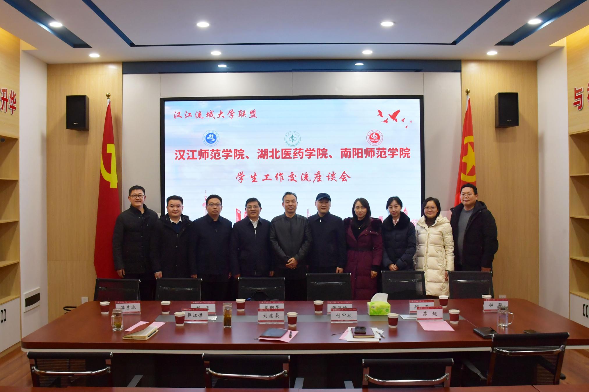 本网讯(郭婷/文 冯一珺/图)11月29日下午,汉江流域大学联盟三校学生工作交流座谈会在新葡萄官网学生服务中心208会议室举行。汉江师范学院党委副书记周明华,学生工作部(处)处长刘飞,校团委书记潘彦冰,湖北医药学院党委常委、党委组织部长张海蛟,党委学生工作部副部长、团委副书记邱爽,校团委组织提升部部长钟骅,新葡萄官网学生处、团委负责同志参加座谈会。学生处处长付中欣主持座谈会。