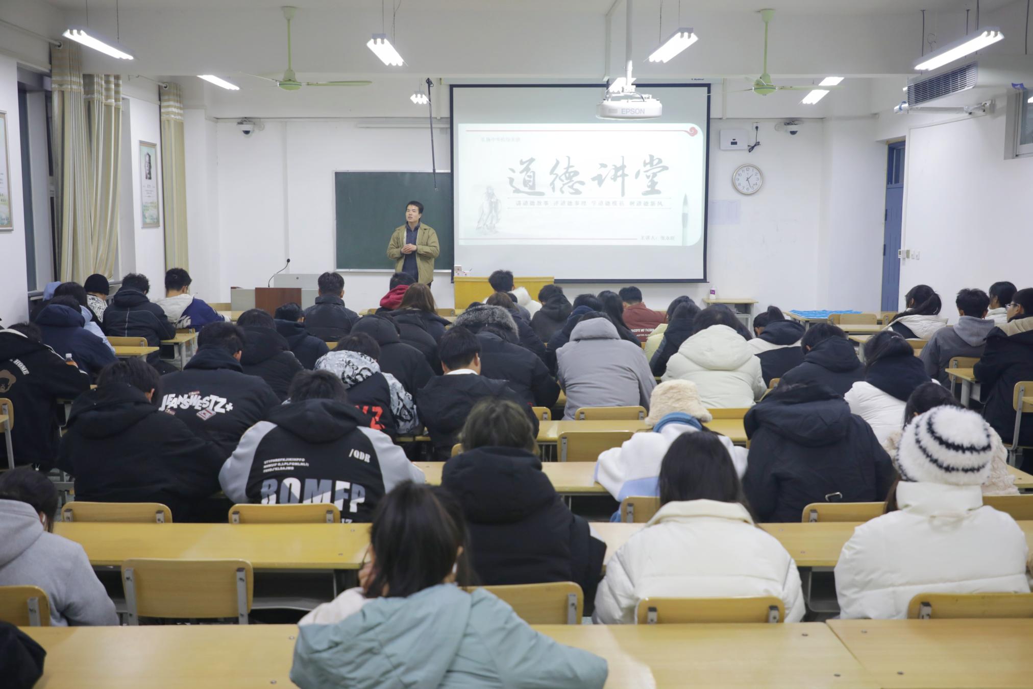 本网讯(孙新皓/文 郑宇棋 刘侗雨/图)12月13日晚,新葡萄官网以“弘扬中华传统美德”为主题的第210期道德讲堂于实训楼2509教室举办。本次活动由土木工程学院2021级辅导员张永旺担任主讲,该院2023级学生参加。