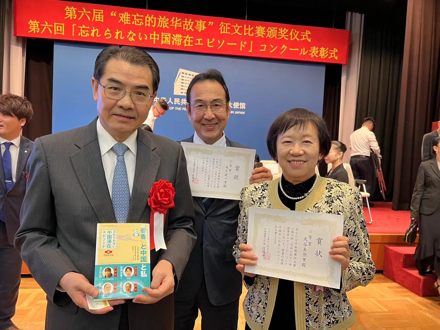 中国驻日本大使吴江浩为获奖代表颁奖。他表示,中日邦交正常化50余年来,两国关系在艰难曲折中取得长足发展。历史反复证明,两国人民是维护和发展健康稳定中日关系的中流砥柱。希望日本民众更多亲身了解和体验新时代中国发展,同中国朋友增进交往和友谊,共同开创两国关系的光明未来。