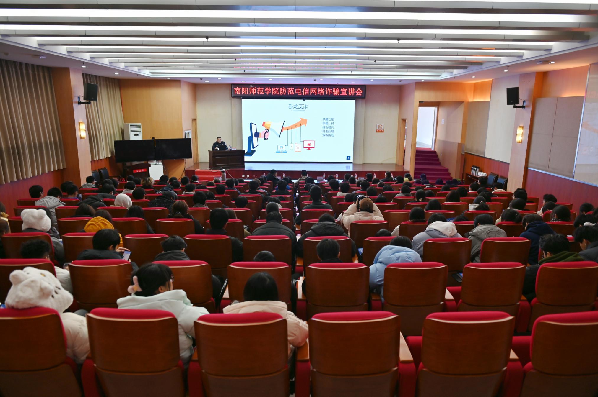 本网讯(王珂/文 李雯 吕莹莹/图)为预防和减少校园电信网络诈骗案件发生,增强大学生识别和防范电信网络诈骗的意识和能力,12月21日下午,保卫处、学生处联合邀请南阳市公安局反诈中心主任付聪及卧龙分局反诈中心主任柏建勋、中队长马耀等在新葡萄官网西区图书馆一楼报告厅作防范电信网络诈骗知识宣讲。部分辅导员及学生代表参加。保卫处处长宋荣岚主持会议。