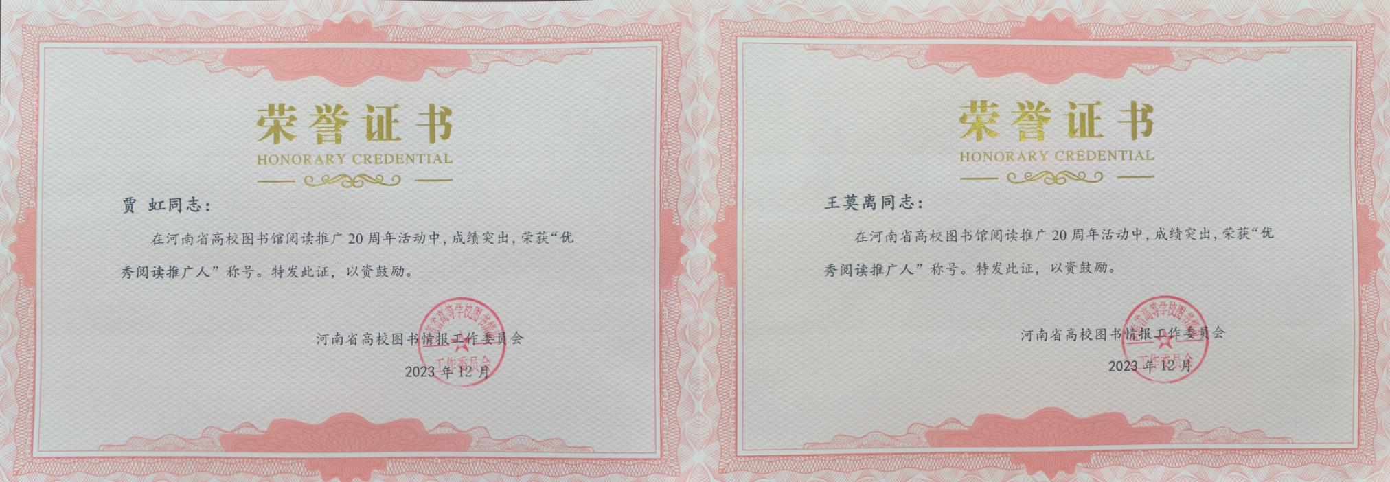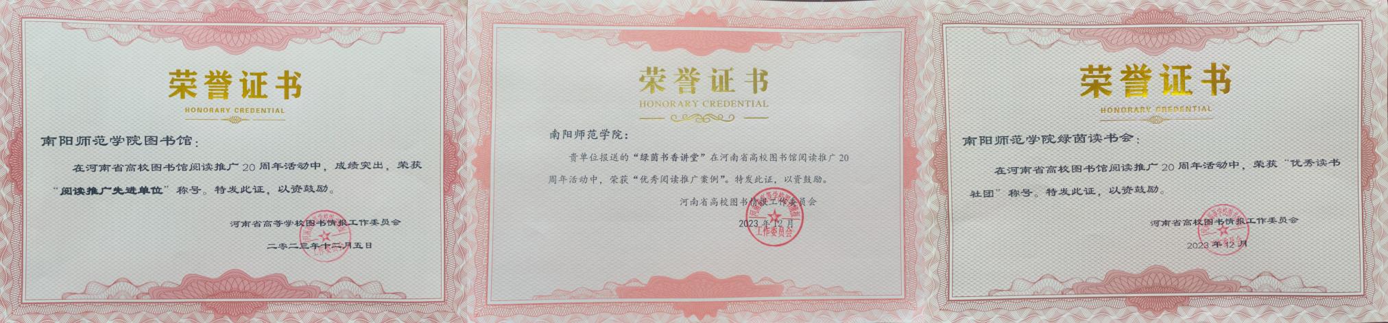 本网讯(通讯员 王莫离)日前,由河南省高校图工委主办的河南省高校图书馆阅读推广20周年总结表彰大会在郑州大学举行。新葡萄官网图书馆荣获“阅读推广先进单位”,贾虹、王莫离荣获“优秀阅读推广人”,绿茵读书会荣获“优秀读书社团”,绿茵读书会指导老师王莫离申报的“绿茵书香讲堂”荣获“优秀阅读推广案例”。王莫离应邀在大会上作《植一片绿茵传万里书香》交流发言,介绍绿茵读书会33年坚持不懈开展阅读推广活动的做法和经验,获得与会领导专家的一致好评。