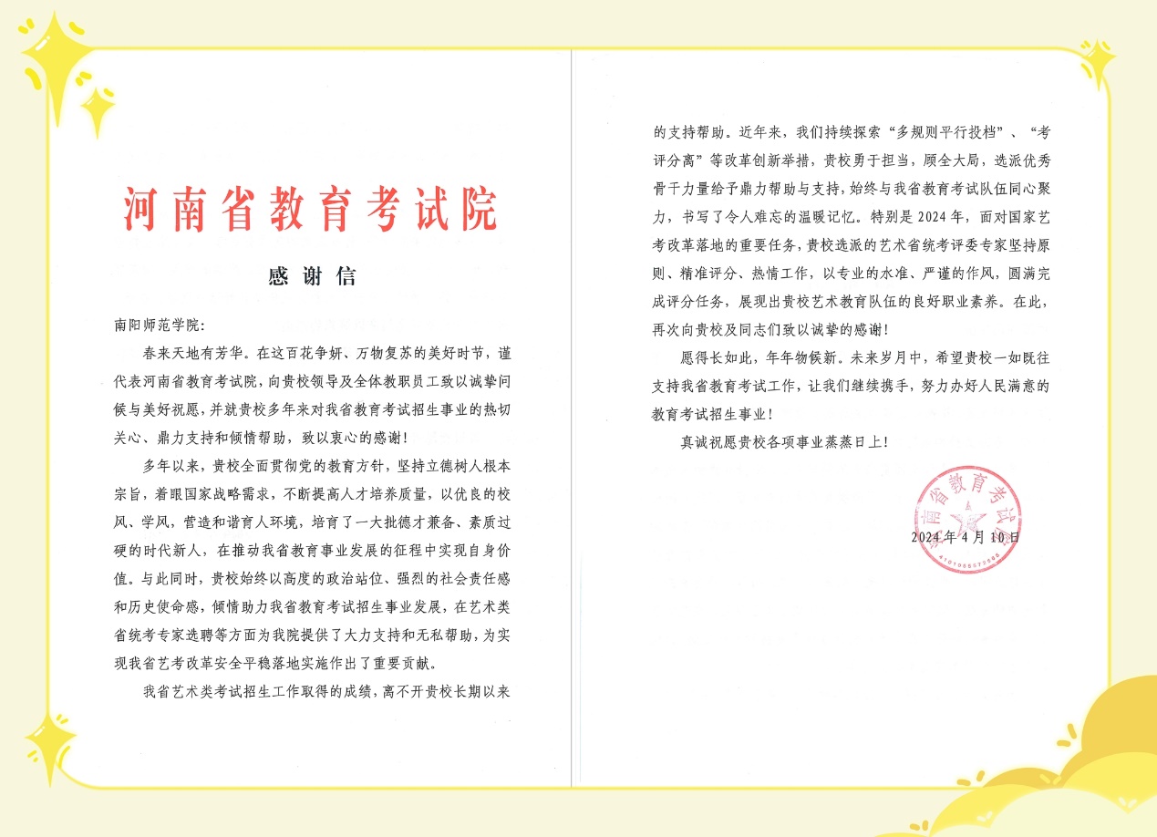 本网讯(通讯员 梁俊松)日前,河南省教育考试院向新葡萄官网发来感谢信,对新葡萄官网在2024年河南省艺术类考试招生工作中所做出的突出贡献表示感谢。教育考试院高度赞扬了新葡萄官网选派艺术类省统考评委的专业素养和敬业精神,对新葡萄官网为艺术招生事业的发展所作的努力给予了充分的肯定。