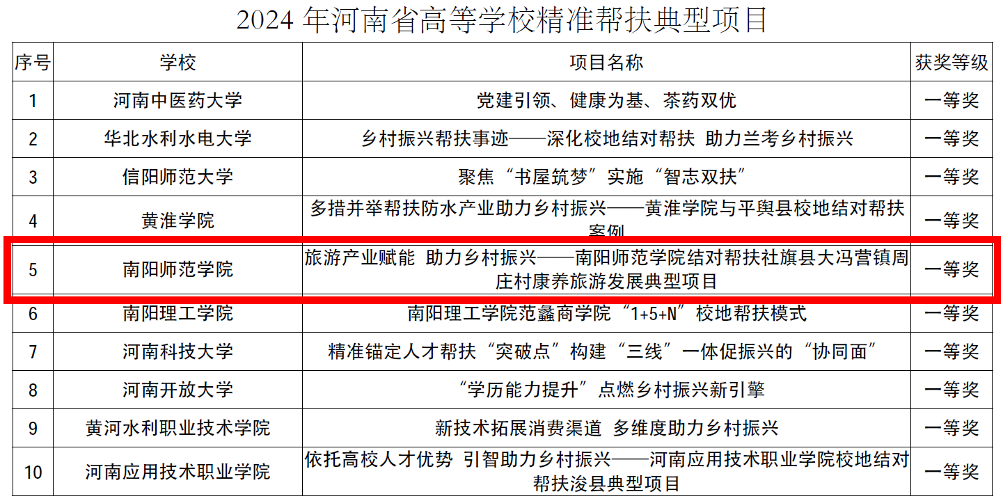 本网讯(通讯员 赵菲菲)近日,河南省教育厅公布 2024 年河南省高等学校精准帮扶典型项目推选结果,新葡萄官网申报的“旅游产业赋能 助力乡村振兴——新葡萄8883官网AMG结对帮扶社旗县大冯营镇周庄村康养旅游发展典型项目”获评一等奖。