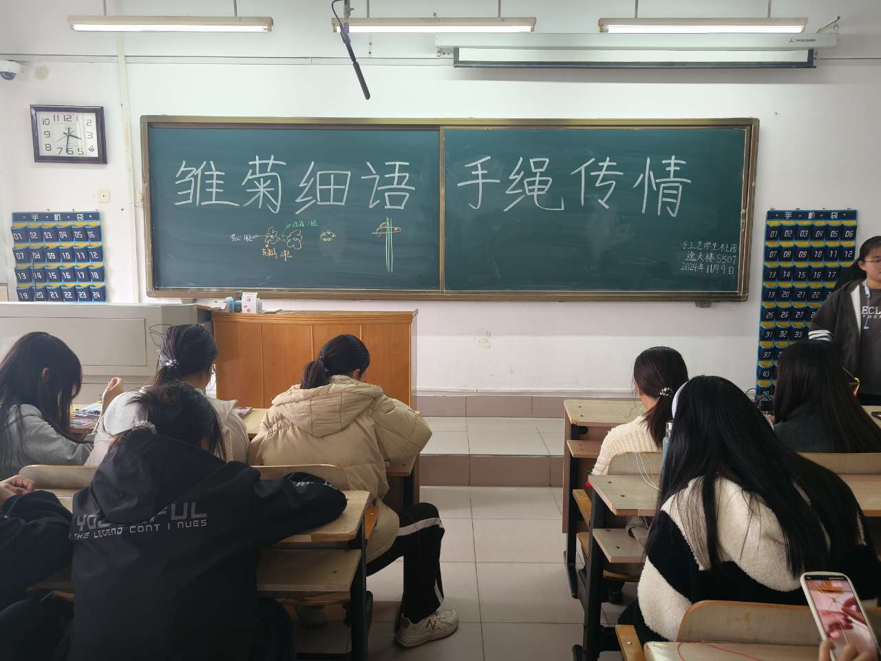 11月9日,手工艺学生社团于逸夫楼S507室举办“雏菊细语,手绳传情”手绳编织活动。社团活动负责人提前准备好编织所需材料,为同学们介绍材料特点并指导大家利用彩绳编织手绳,完成作品后同学们互相交换、共同交流,纷纷表示感受到了手工编织和传统文化的魅力和乐趣。