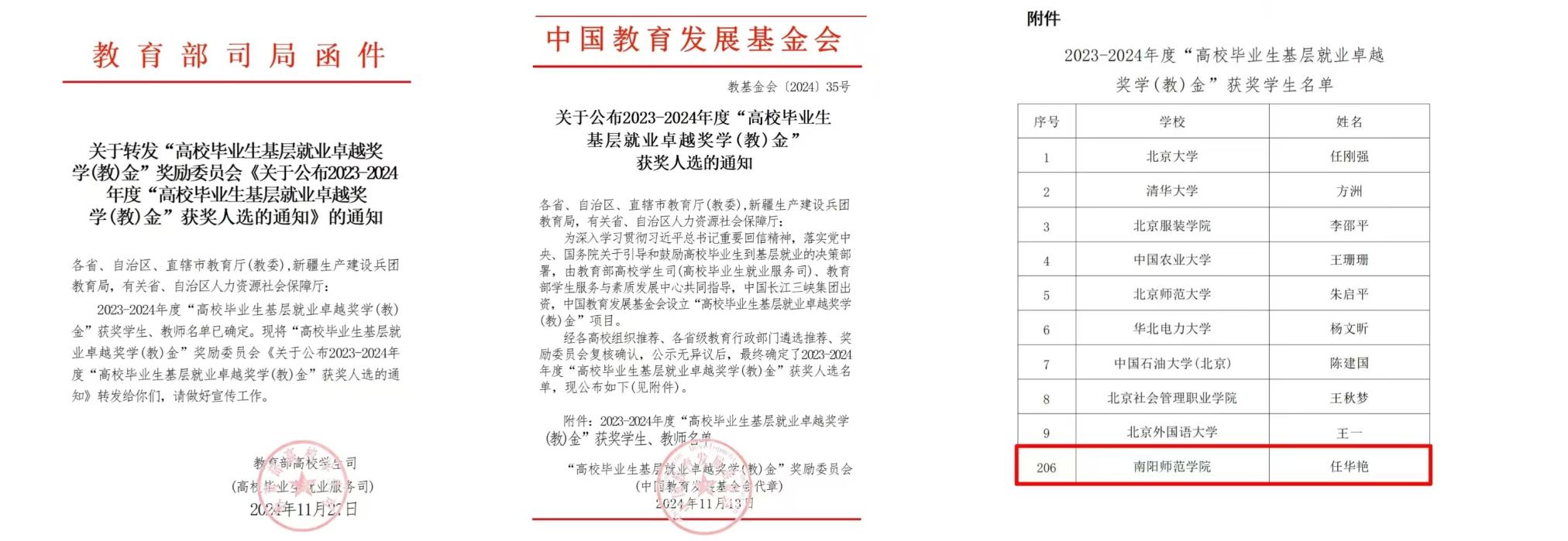 本网讯(通讯员 杨磊)近日,由教育部高校学生司(高校毕业生就业服务司)、教育部学生服务与素质发展中心共同指导颁发的2023-2024年度“高校毕业生基层就业卓越奖学(教)金”入选名单公布,全国398名毕业生入选。经新葡萄官网创新创业学院精心组织申报,河南省教育厅遴选推荐,新葡萄官网美术与艺术设计学院2016届美术学专业本科毕业生任华艳获此殊荣。