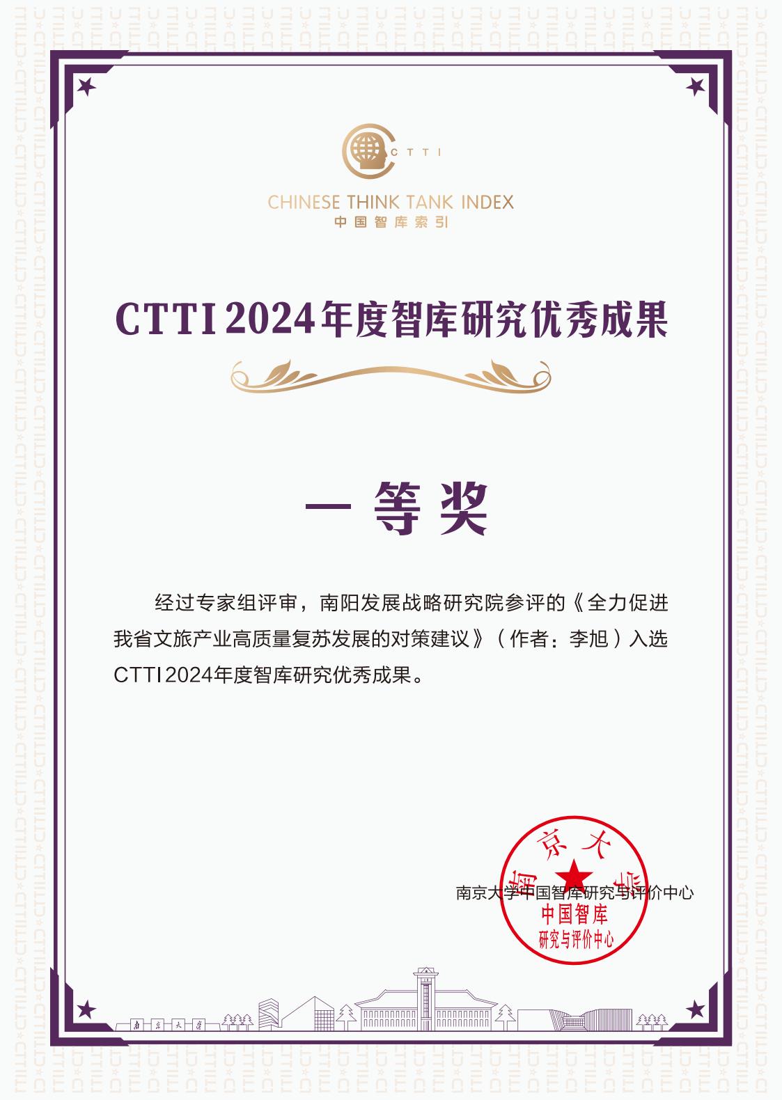 本网讯(通讯员 李旭)日前,由南京大学、兰州大学共同主办的“2024新型智库治理论坛”在兰州大学举行。会议发布了中国智库索引(CTTI)2024年来源智库名录、2024CTTI智库建设最佳案例和智库研究优秀成果。新葡萄官网南阳发展战略研究院成功入选中国智库索引(CTTI)2024年来源智库。同时,该院申报的《探索“三维一体”工作机制,提升高校智库决策服务水平》获智库建设最佳案例奖,《全力促进我省文旅产业高质量复苏发展的对策建议》(作者:李旭)获优秀研究成果一等奖。