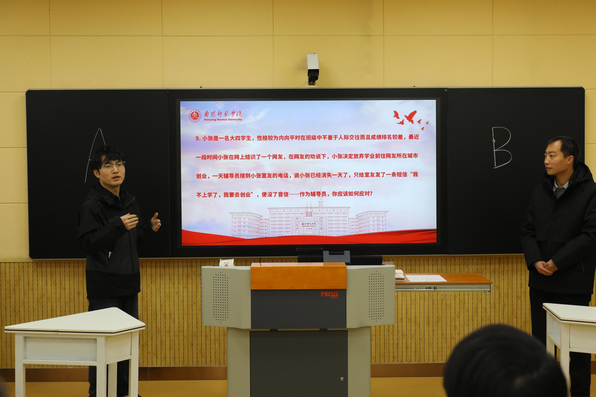 本次大赛自2024年12月启动以来,历经初赛(基础知识测试)、复赛(案例分析)和决赛(谈心谈话)三个环节。初赛由全体辅导员参加,成绩合格者46人参加复赛,经过复赛最终28名辅导员脱颖而出进入决赛。决赛现场,参赛选手和学生助演就组织发展、电信诈骗、宿舍矛盾、班团建设、评奖评优等“困惑”开展谈心谈话,实境还原了辅导员的现实工作场景,展现了新葡萄官网辅导员扎实的专业能力和以学生为本的工作理念。经过激烈角逐,物理与电子工程学院张晓、人工智能与软件工程学院陈欣、化学与制药工程学院黄素珍、历史学院全越、物理与电子工程学院冯若丹荣获特等奖;另外还评选出一等奖10人、二等奖13人。