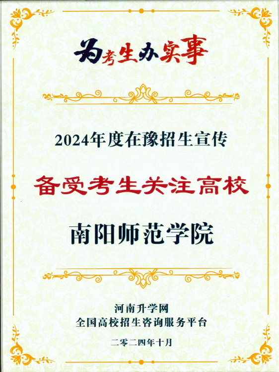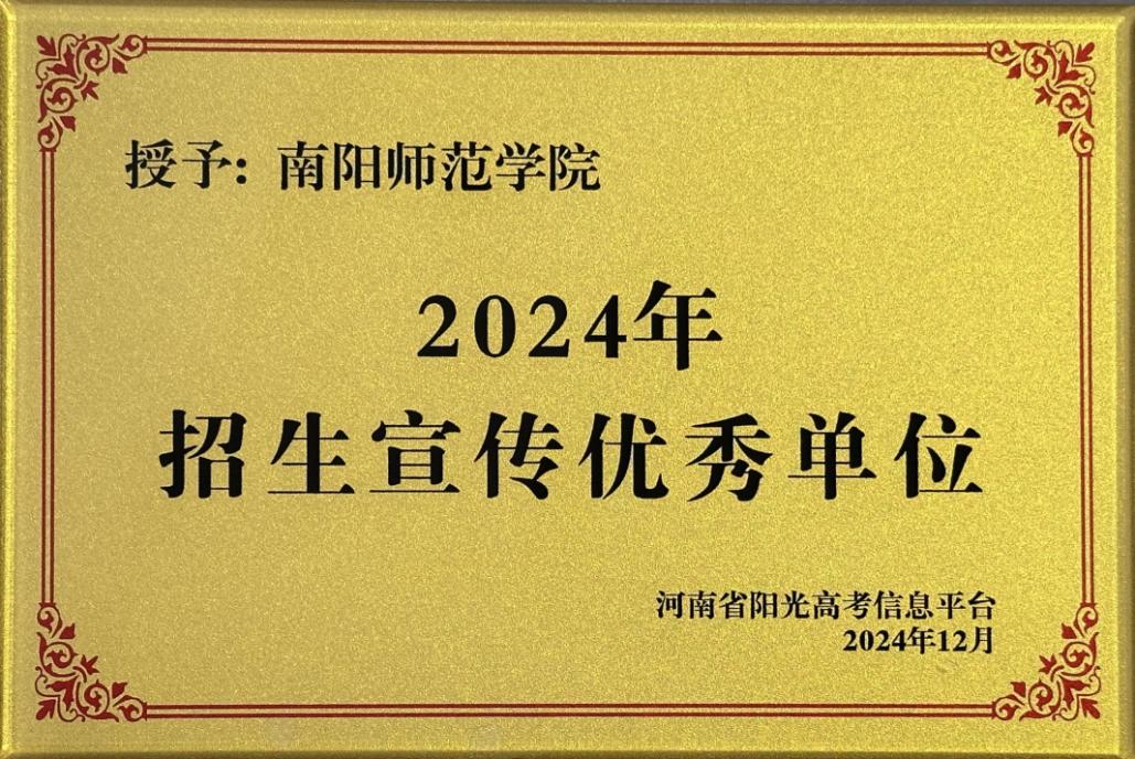 河南省阳光高考信息平台根据对全省各高校招生信息公开的数量和实效性、咨询回复质量等情况综合评定,授予新葡萄官网“2024年招生宣传优秀单位”荣誉称号。