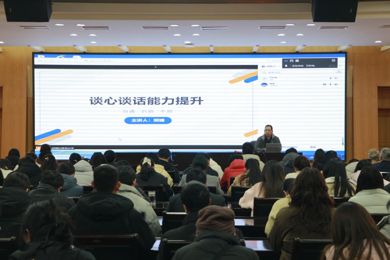本网讯(孙培蕾/文 邓君杰/图)2月25日下午,新葡萄官网在科技大楼三楼会议室举行2025年学生工作队伍谈心谈话技能线上培训会。本次培训会由武汉理工大学心理健康教育中心熊婕副教授主讲。学生工作队伍全体成员、心理咨询师团队近200人参加。培训会由学生发展中心(心理健康教育中心)副主任刘柏涛主持。