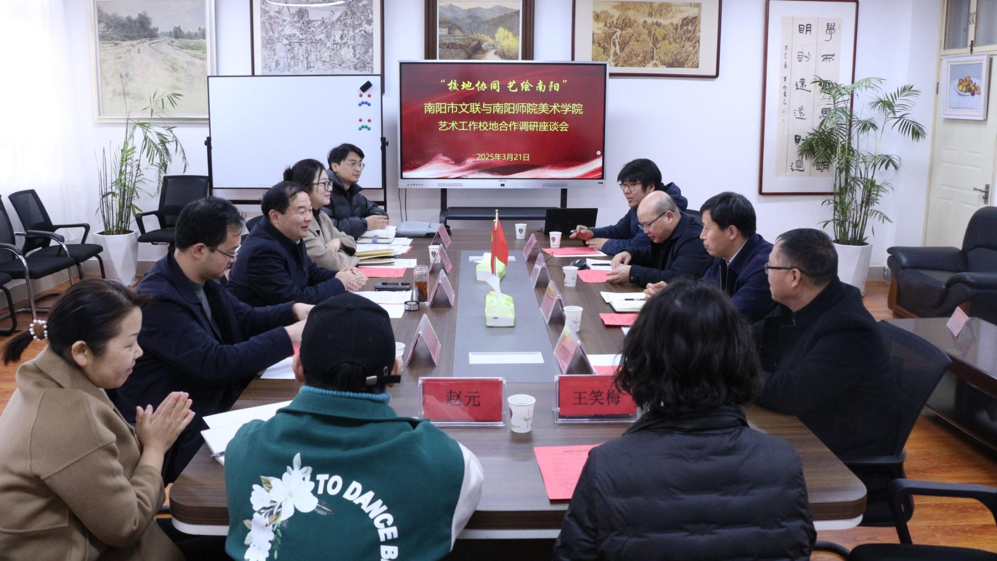 本网讯(张鑫/文 曹娜/图)3月21日,市文联与新葡萄官网美术与艺术设计学院联合主办的“校地协同 艺绘南阳”艺术工作校地合作调研座谈会在艺术楼315会议室举行。南阳市文联党组书记、主席雷洪波出席座谈会并调研指导学院艺术工作,南阳美术馆(书画院)院长胡文淑、市文联办公室副主任乔洋、南阳美术馆负责人和学院领导班子成员及教师代表参加。会议由美术与艺术设计学院副院长陈晅嵘主持。