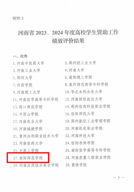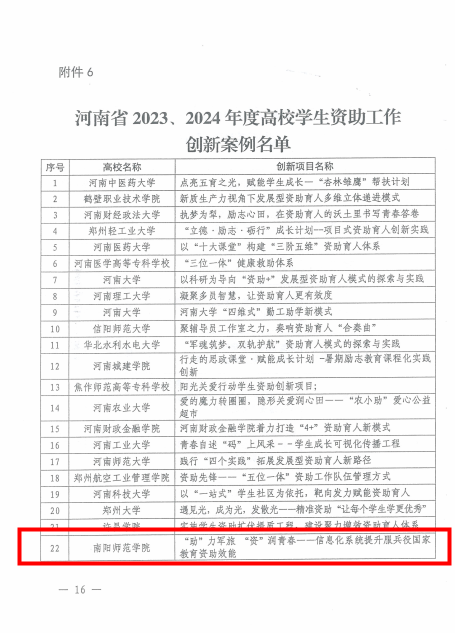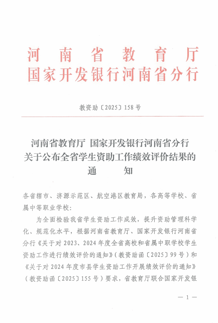 本网讯(通讯员 程丹丹)近日,河南省教育厅 国家开发银行河南省分行发布《关于公布全省学生资助工作绩效评价结果的通知》(教资助〔2025〕158号),公布2023、2024年度全省高校、省属中职学校以及2024年度市县学生资助工作绩效评价结果。新葡萄官网获评绩效评价“优秀”等级。同时,新葡萄官网申报的学生资助工作创新性项目《“助”力军旅“资”润青春——信息化系统提升服兵役国家教育资助效能》被认定为学生资助工作创新案例。