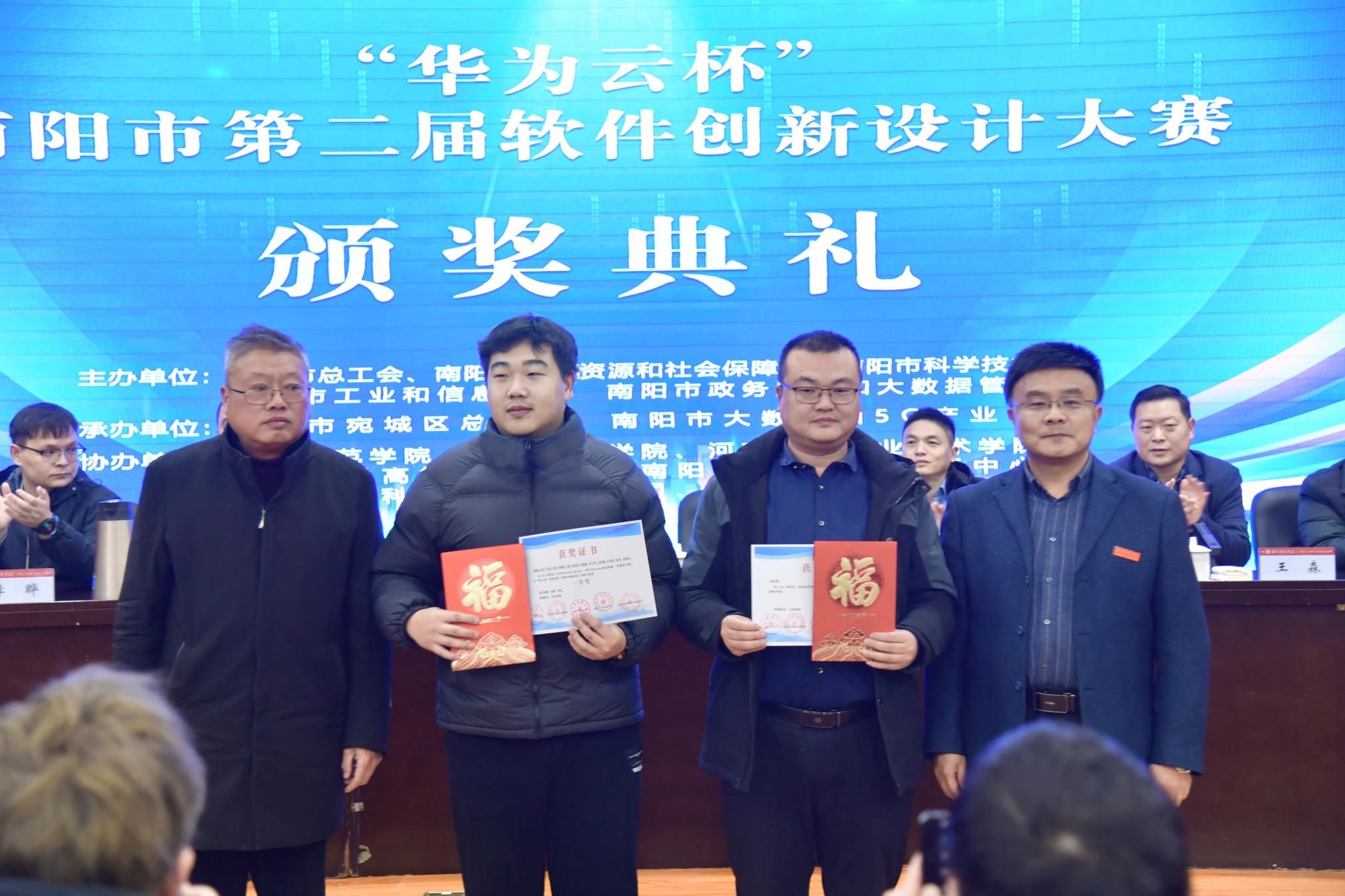 本网讯(徐照波/文 王嘉豪 曹艺鹏/图)1月16日下午,“华为云杯”南阳市第二届软件创新设计大赛颁奖典礼在新葡萄官网科技大楼三楼会议室举行。副校长刘红林、南阳市科学技术局副局长王东良、南阳市人力资源和社会保障局四级调研员林新春、南阳市政务服务和大数据管理局总架构师张凯、南阳市大数据和5G产业协会会长王森等出席会议,新葡萄官网创新创业学院、人工智能与软件工程学院主要负责同志及获奖选手参加。