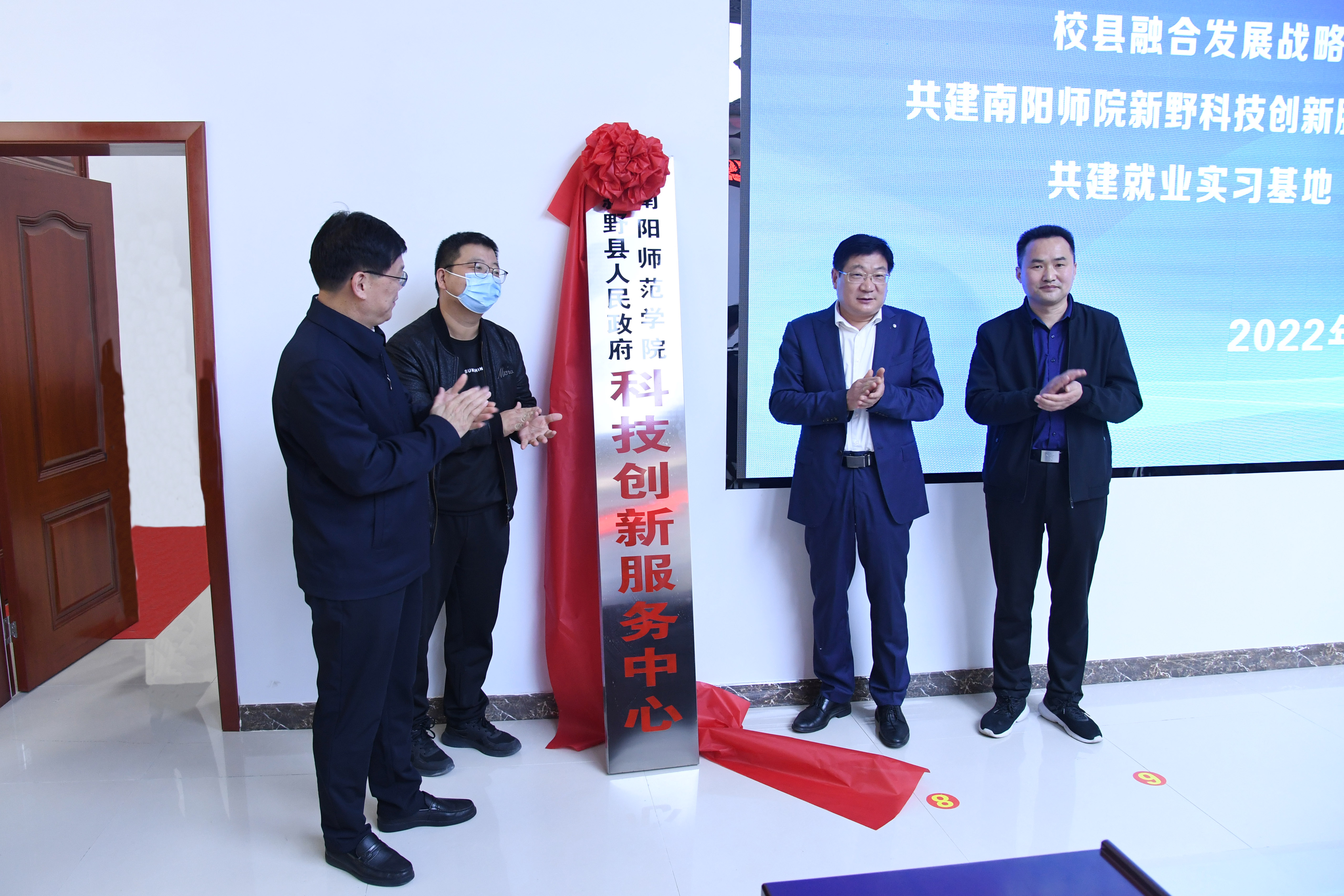 副校长刘红林、南阳科技大市场总经理丁凌飞和新野县副县长孔令东签署了《校地合作科技服务协议》。