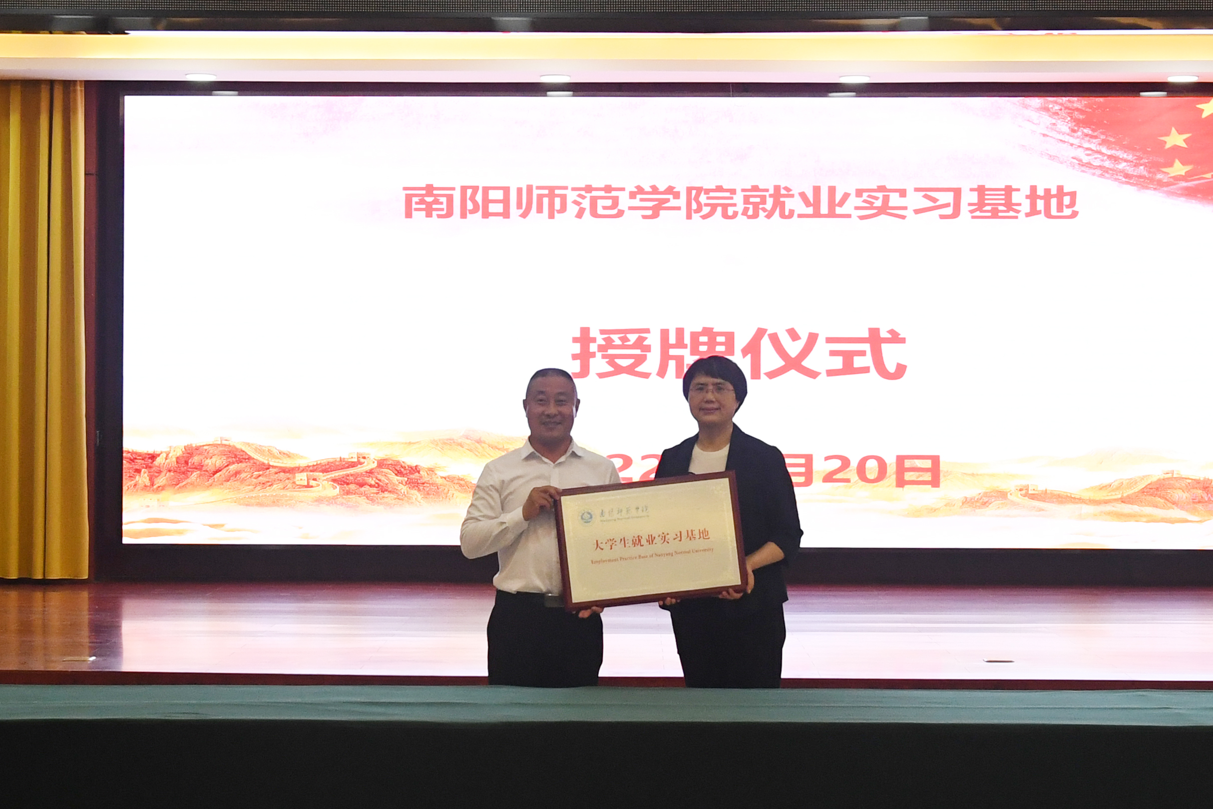 副校长孟静雅为镇平县商务局、想念食品股份有限公司、镇平县社会心理协会授就业实习基地牌匾。(编审 时树菁)