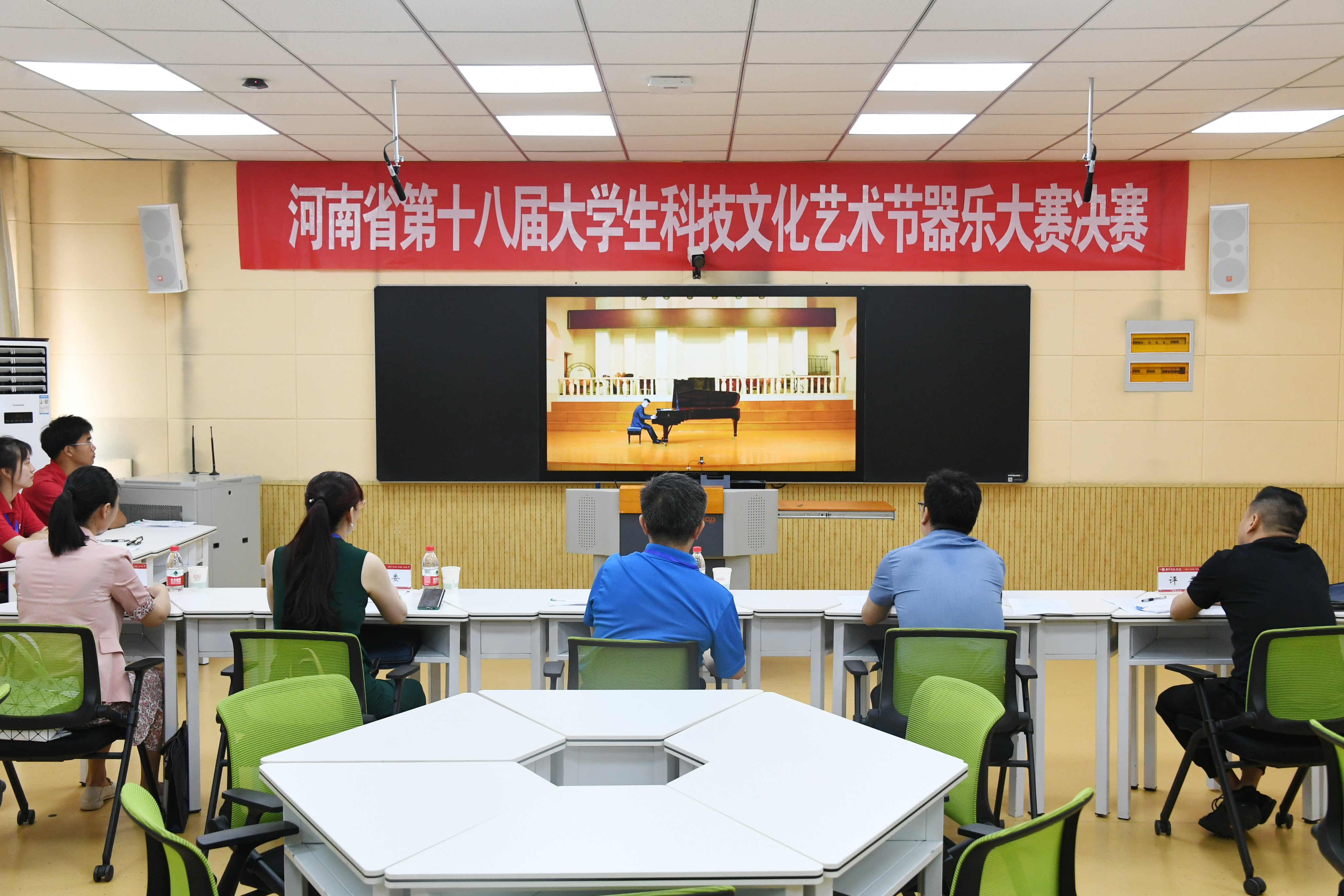本次比赛按器乐类型分西洋器乐、民族器乐和键盘共三大类,专业和业余六个组别,选手作品以提前录制、现场播放的形式呈现,共有来自郑州大学、河南大学等省内高校、专业领域的十五位专家组成评审团进行评比。评委老师们根据作品的思想内容、演奏形式、演奏技巧、演奏节奏和选手的比赛台风进行现场打分。