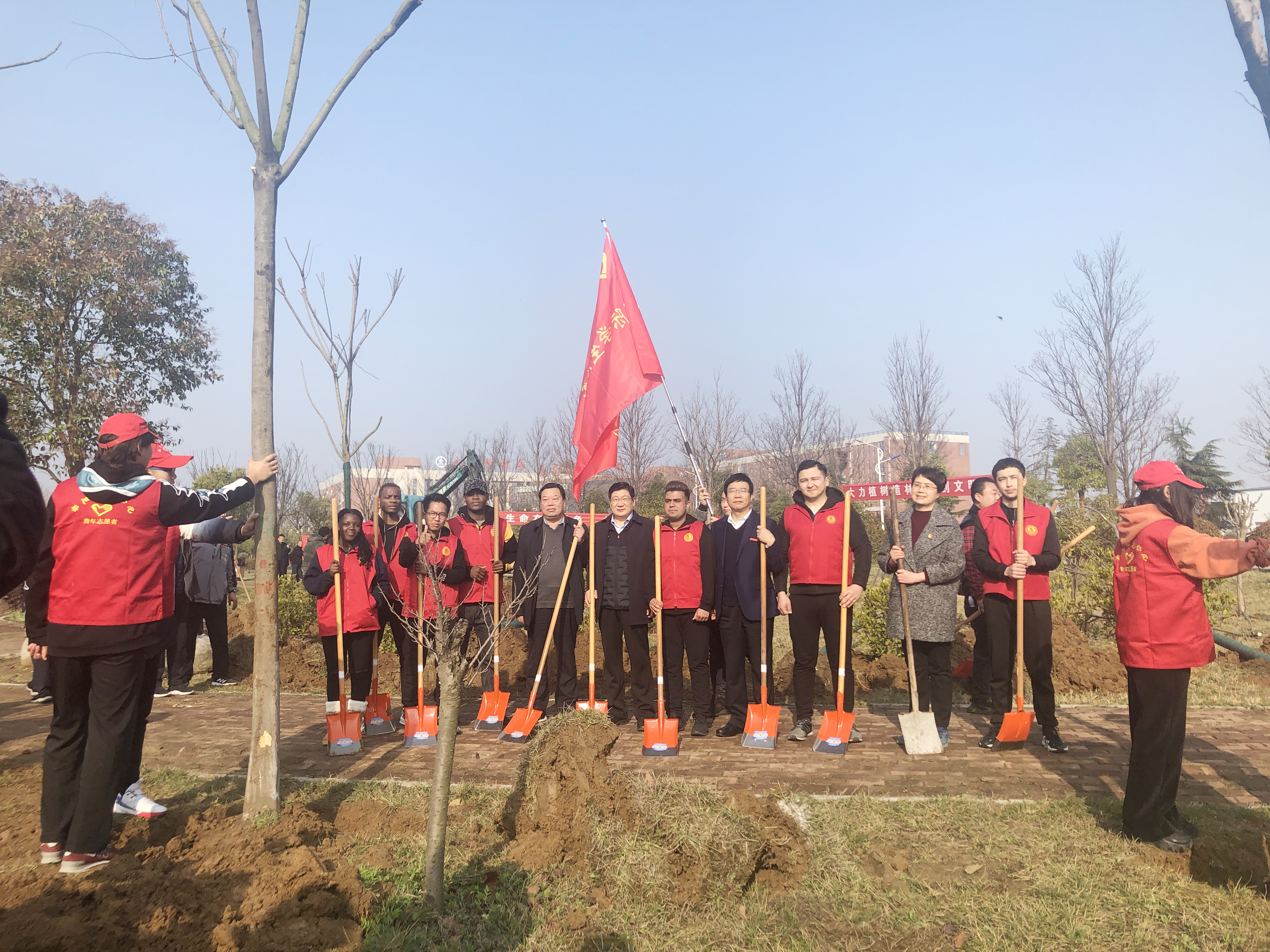 图:国际学生参加学校义务植树活动