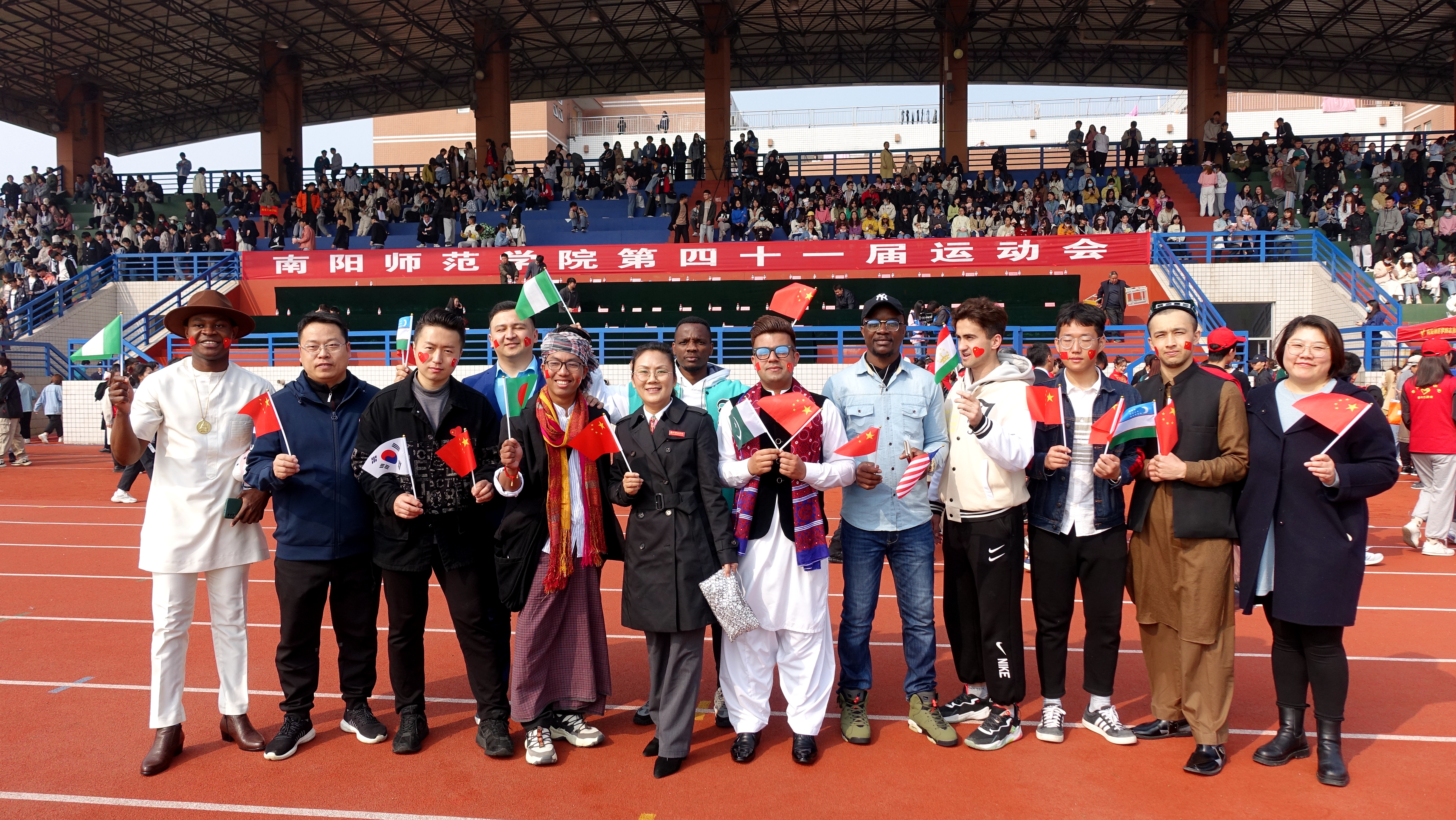 图:国际学生参加学校运动会开幕式