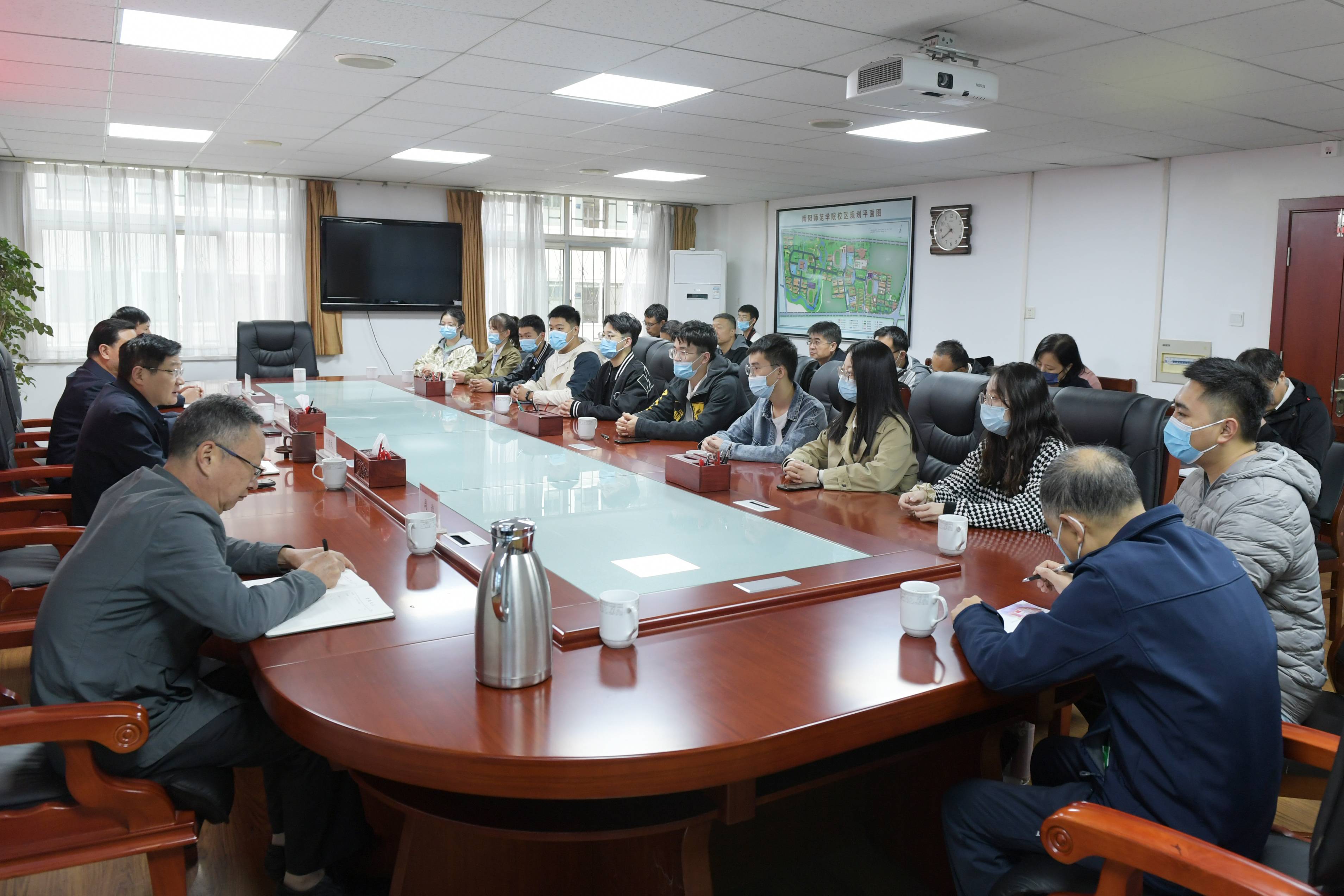 卢志文一行深入研究生宿舍,与学生们进行了面对面交流,听取了他们学习、生活等方面的意见建议,实地考察了研究生活动中心的建设进度。随后,在办公大楼三楼会议室召开研究生工作座谈会。会上,学生代表逐一发言,感谢学校为改善研究生学习生活条件做出的努力,对进一步完善淯阳书院的育人环境提出了合理化建议。