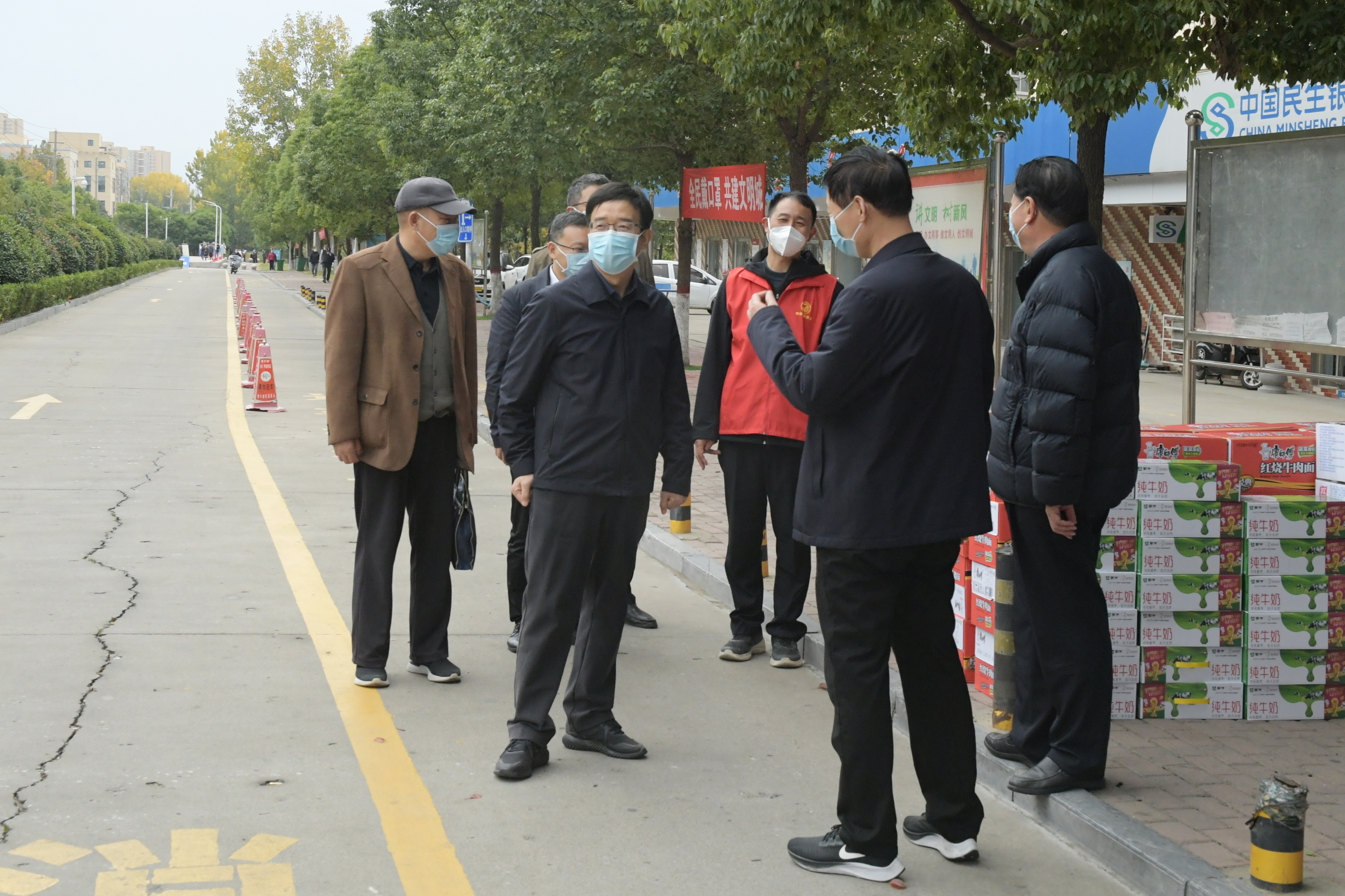 本网讯(齐海彬/文 王嘉豪/图)11月12日上午,校党委书记卢志文、校长张宝锋、党委副书记谢冰松、副校长朱其春、熊新忠等分两组深入学校疫情防控一线,看望慰问坚守岗位工作人员。党委办公室、院长办公室、工会等部门负责人陪同慰问。