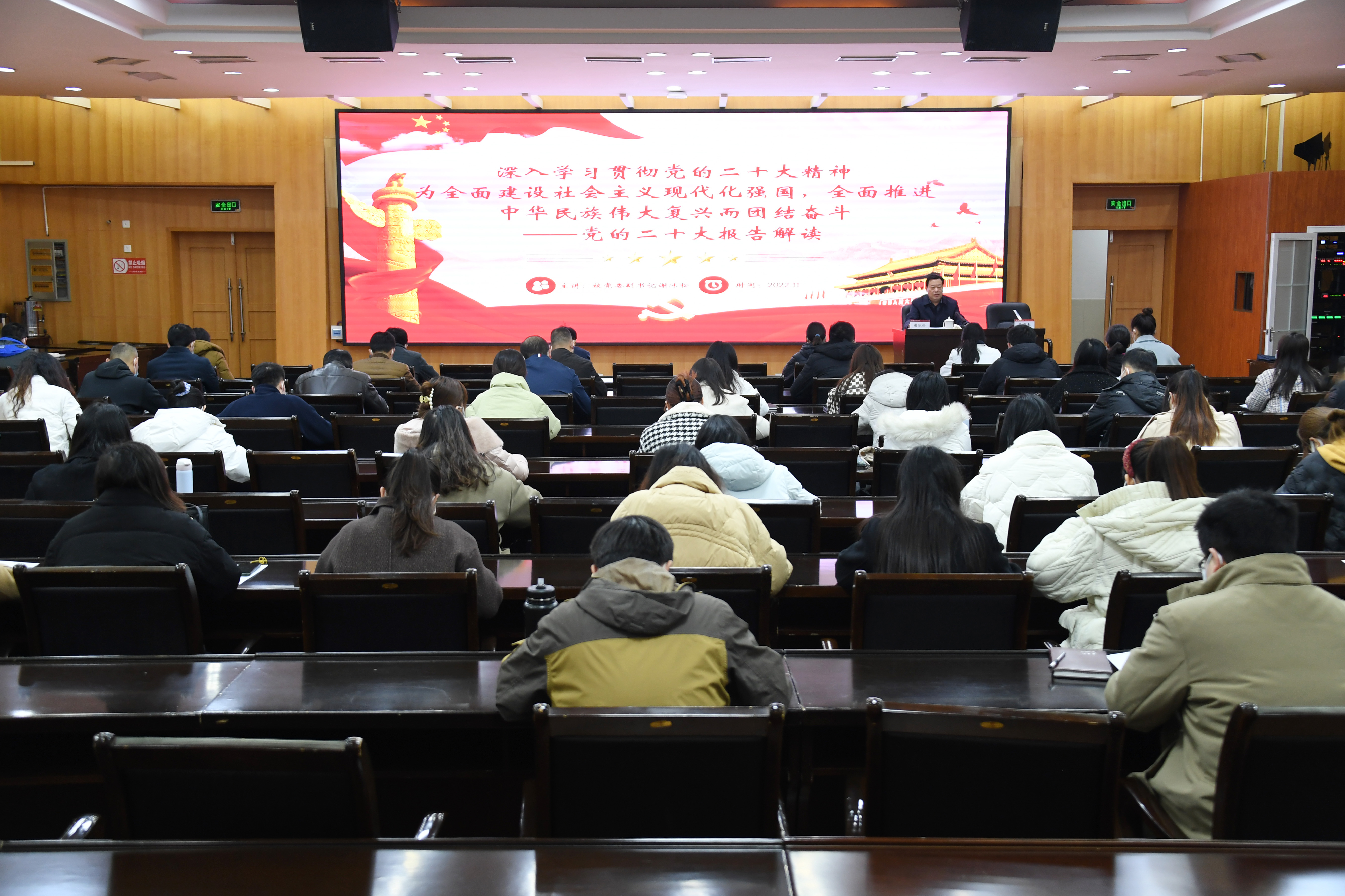 谢冰松从党的二十大召开时代背景、党的二十大报告解读、党的二十大报告创新点、如何学习宣传贯彻党的二十大精神等四个方面,对党的二十大报告进行系统讲解。谢冰松结合理论资料与学习实践经验,用“三个之变”“四个之问”凝练党的二十大召开的时代背景。他将党的二十大报告划分七大模块,用数据串联大量事实,深入解读党的二十大报告丰富内涵,并结合自身学习体会,用“五个首次”总结党的二十大报告创新点。他表示,全体学工队伍要聚焦“五个牢牢把握”,结合学生工作实际,学以致用,切实把党的二十大精神学习成效转化为推动学校高质量发展的生动实践。