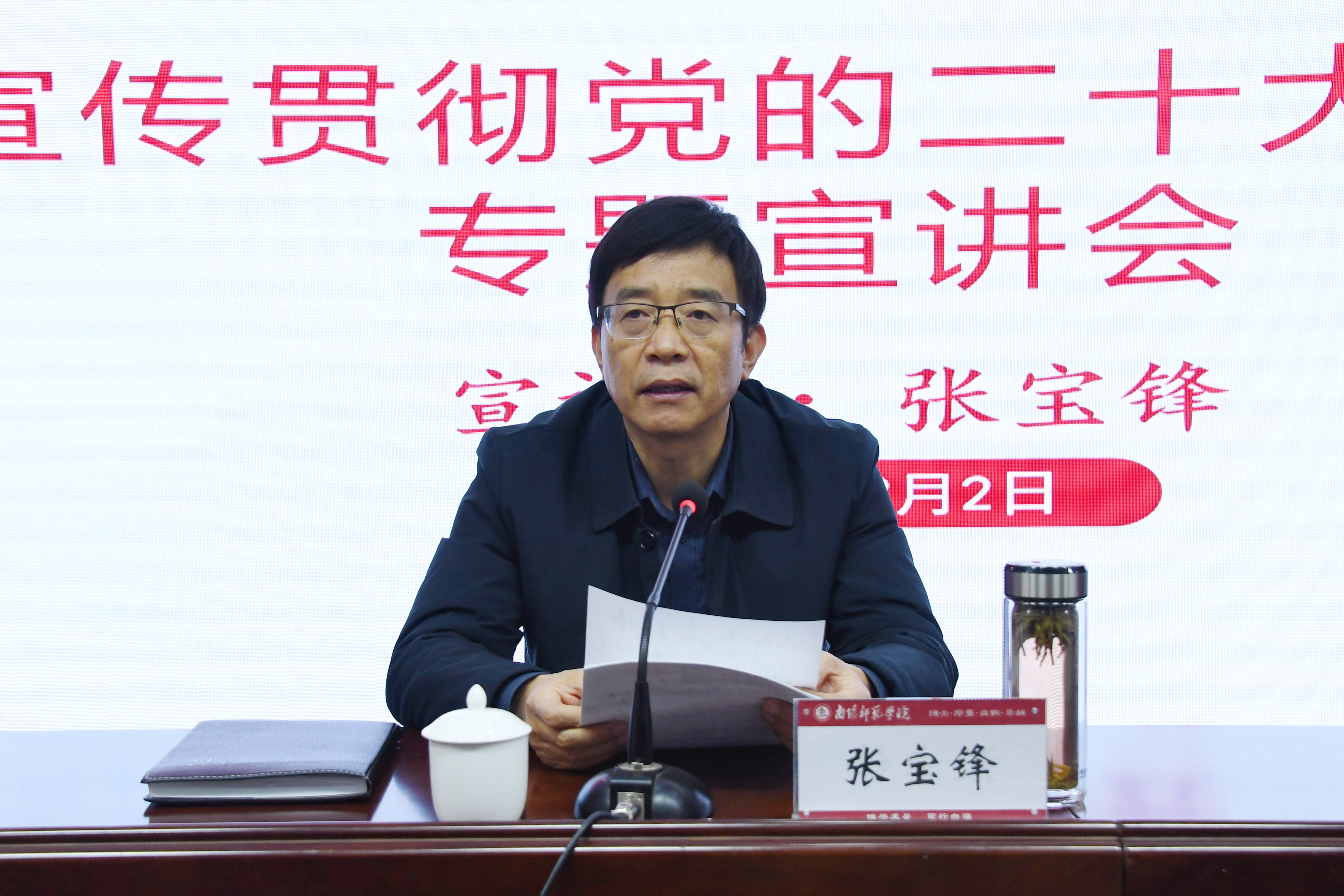 张宝锋从六个方面对党的二十大精神进行了深入讲解。第一个方面讲解了党的二十大召开的意义,第二个方面总结了党的十八大以来新时代十年的伟大变革,第三个方面深入阐述了新时代中国特色社会主义思想的世界观和方法论,第四个方面分析了中国式现代化的内涵和实施路径,第五个方面着重明确了实施科教兴国战略,强化现代化建设人才支撑对高等教育工作提出的要求,第六个方面对党的自我革命做出了全面讲解。