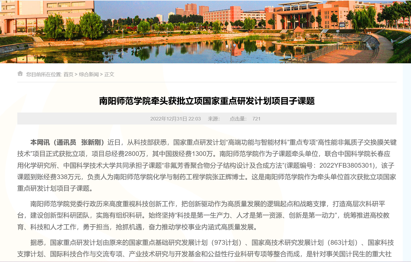 牵头获批立项国家重点研发计划项目子课题“非氟芳香聚合物分子结构设计及合成方法”