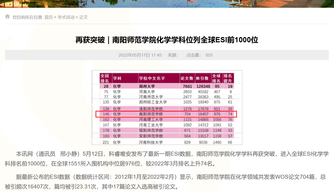 新葡萄8883官网AMG化学学科进入全球ESI化学学科排名前1000位