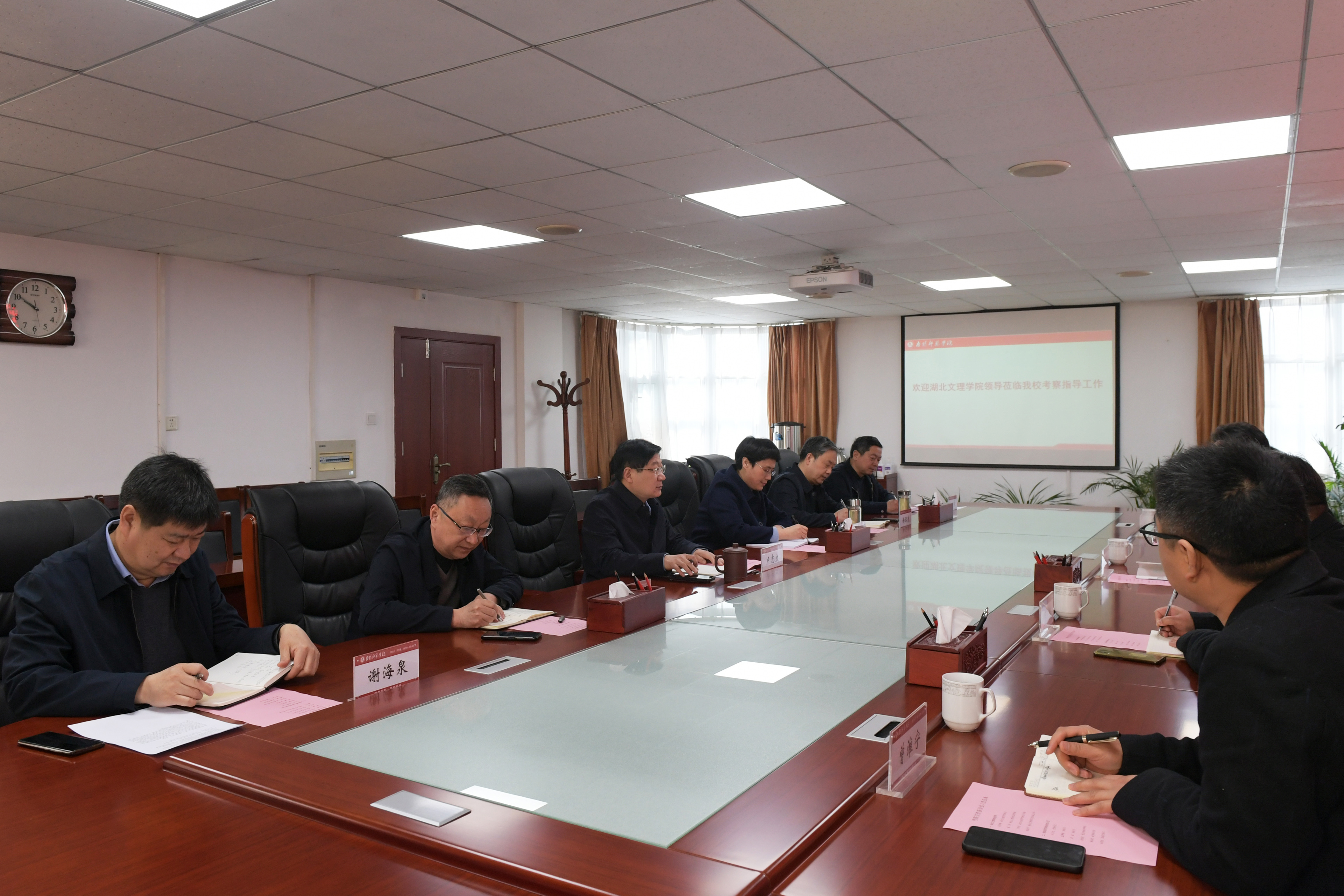 本网讯(周耀民/文 郝亚江/图)3月15日上午,湖北文理学院校长张彦铎、副校长曹健,校办主任王守忠、副主任曾淮宁一行来校考察交流。座谈会在办公大楼三楼会议室举行。校党委书记卢志文主持座谈会,副校长孟静雅、周旗出席。党委办公室、党委组织部、教务处、基建处负责同志参加座谈。