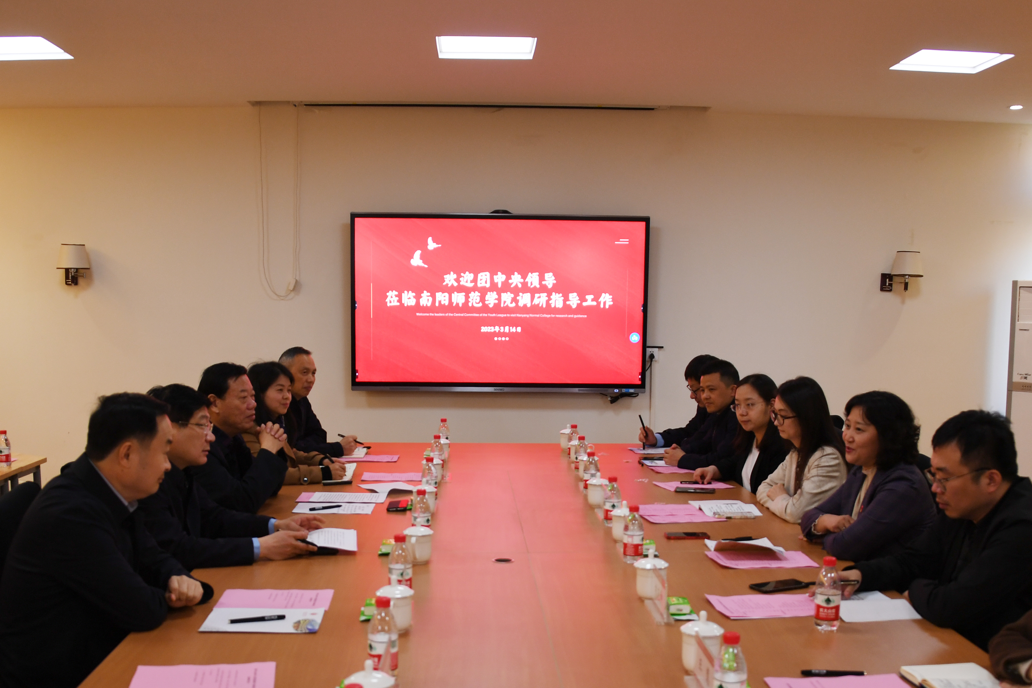本网讯(通讯员 李珂 杨婷/文 崔雅雯 曹艺鹏/图)3月14日上午,团中央少年部副部长、全国少工委副主任夏新颜,中国青少年研究中心青年发展研究所副所长张晓冰,团中央少年部辅导员工作处胡范坤一行来新葡萄官网调研。河南省少先队总辅导员、省少工委副主任王慧,共青团南阳市委副书记林丽等省市领导陪同。新葡萄官网党委书记卢志文、党委副书记谢冰松出席座谈会。教育科学学院、校团委负责同志,小学教育专业教师、学生代表参加座谈。会议由谢冰松主持。