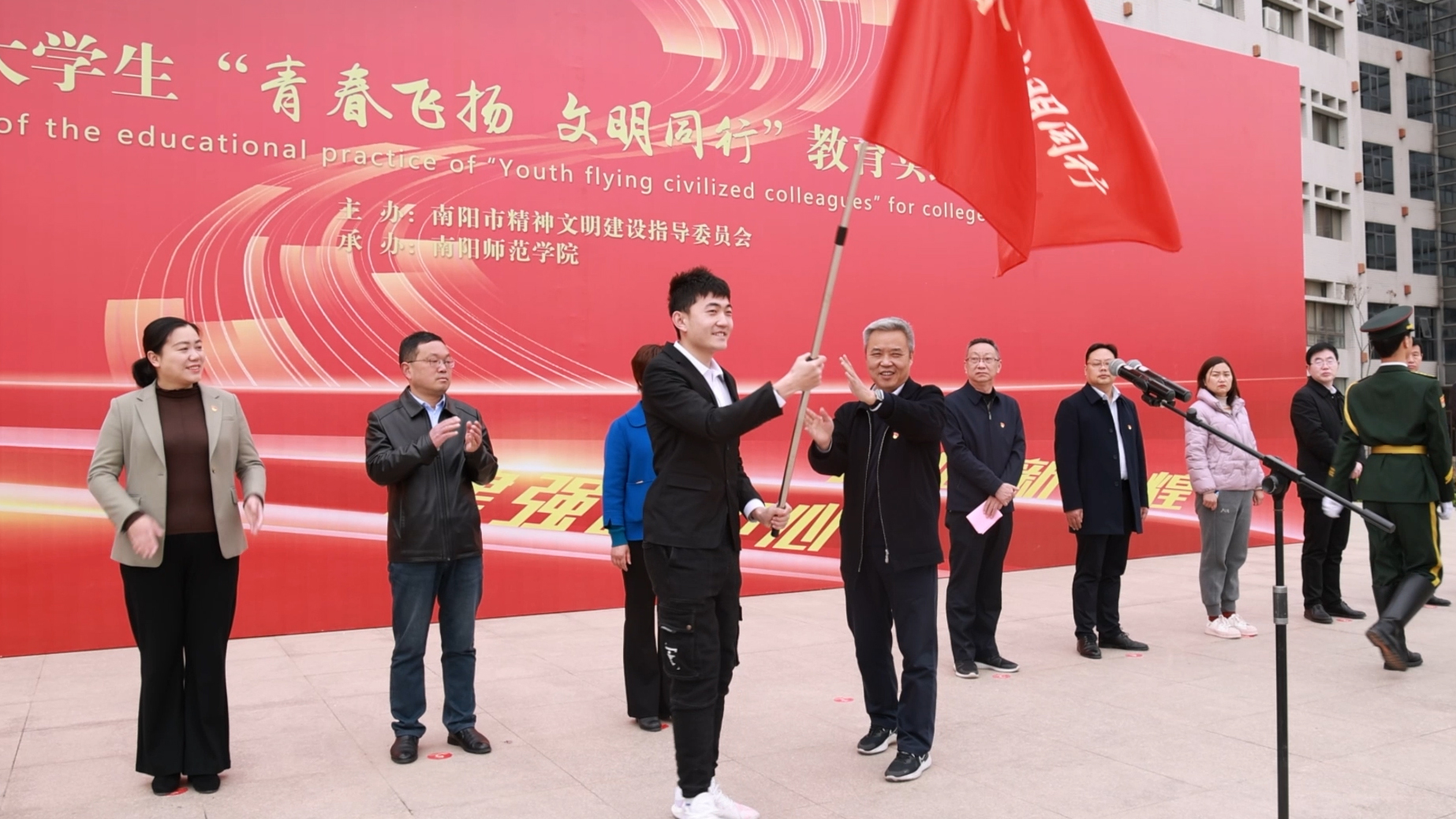 马洪泉为5所高校代表授旗,并宣布南阳市高校大学生“青春飞扬 文明同行”教育实践活动正式启动。