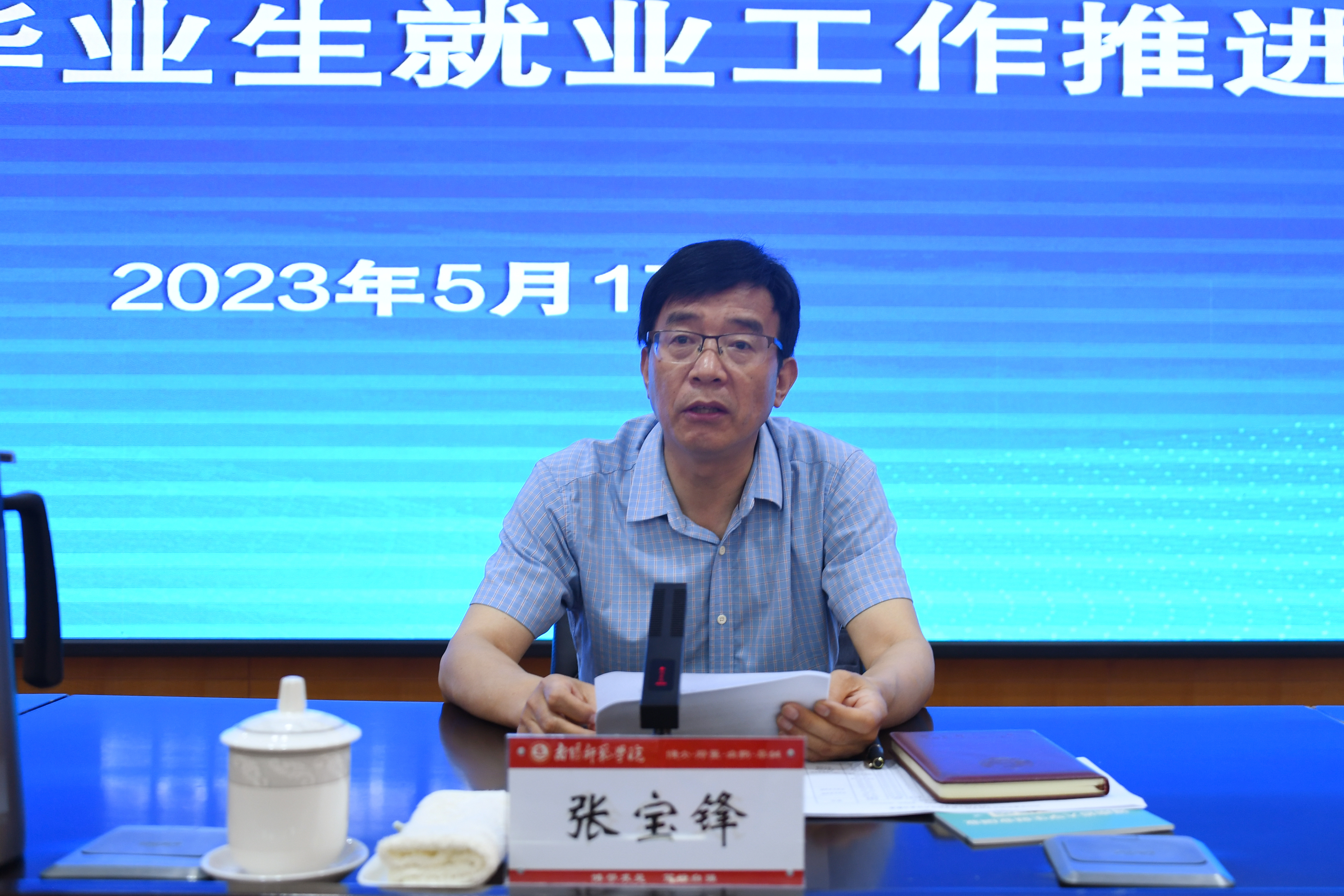 张宝锋通报了2023届毕业生就业去向落实情况,传达学习了河南省人民政府办公厅印发的《2023年河南省支持高校毕业生等青年就业创业若干政策措施》的通知文件,部署和安排了近期重点工作。他指出,一要突出质量提升,聚焦关键目标;二要加快推进力度,提升工作实效;三要聚焦重点群体,做好就业帮扶;四要严守工作纪律,确保数据真实;五要加强组织领导,压实工作责任。