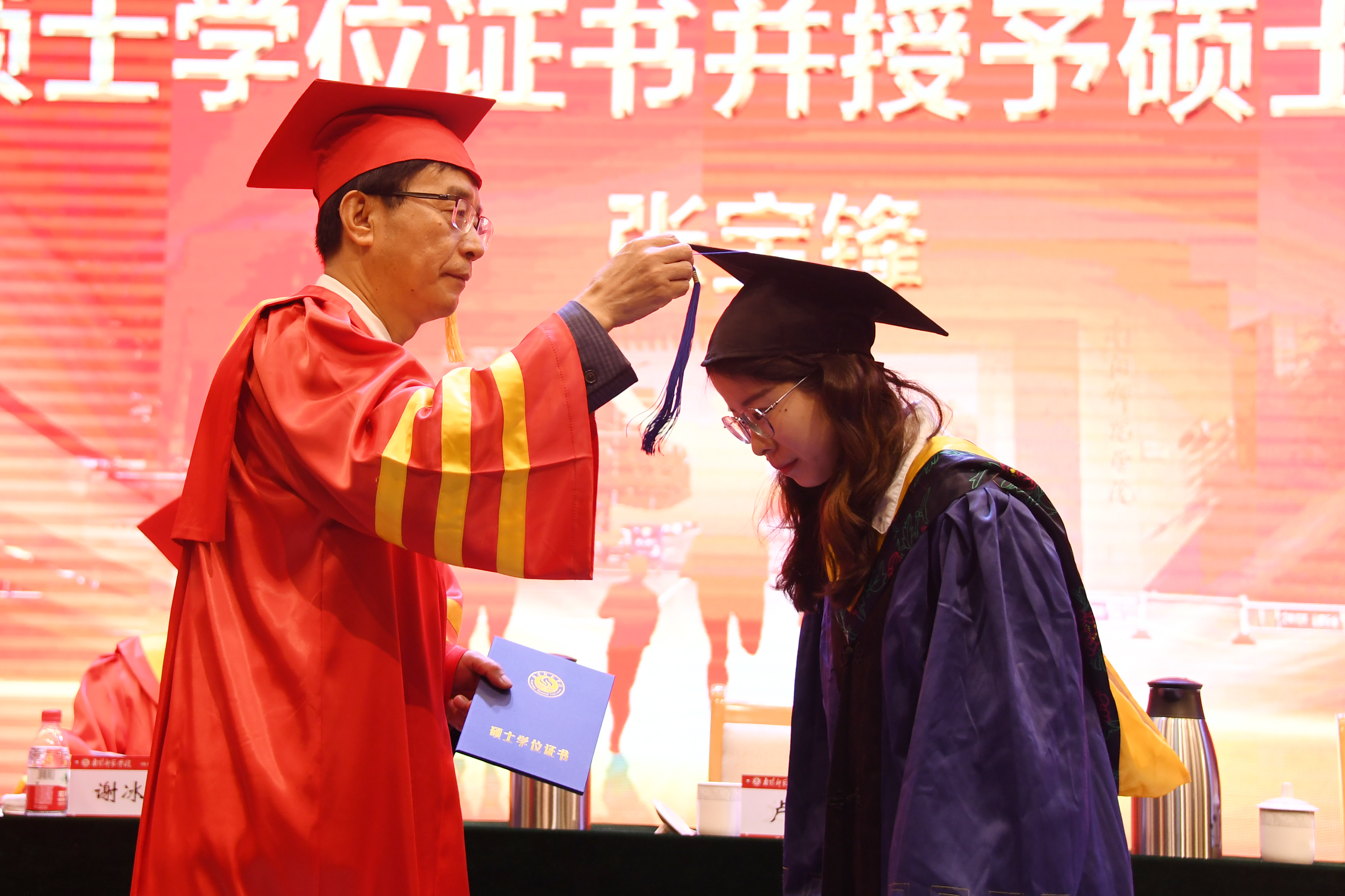 3校学位委员会主席、校长张宝锋教授为2023届优秀毕业生颁发学位证书并拨正流苏