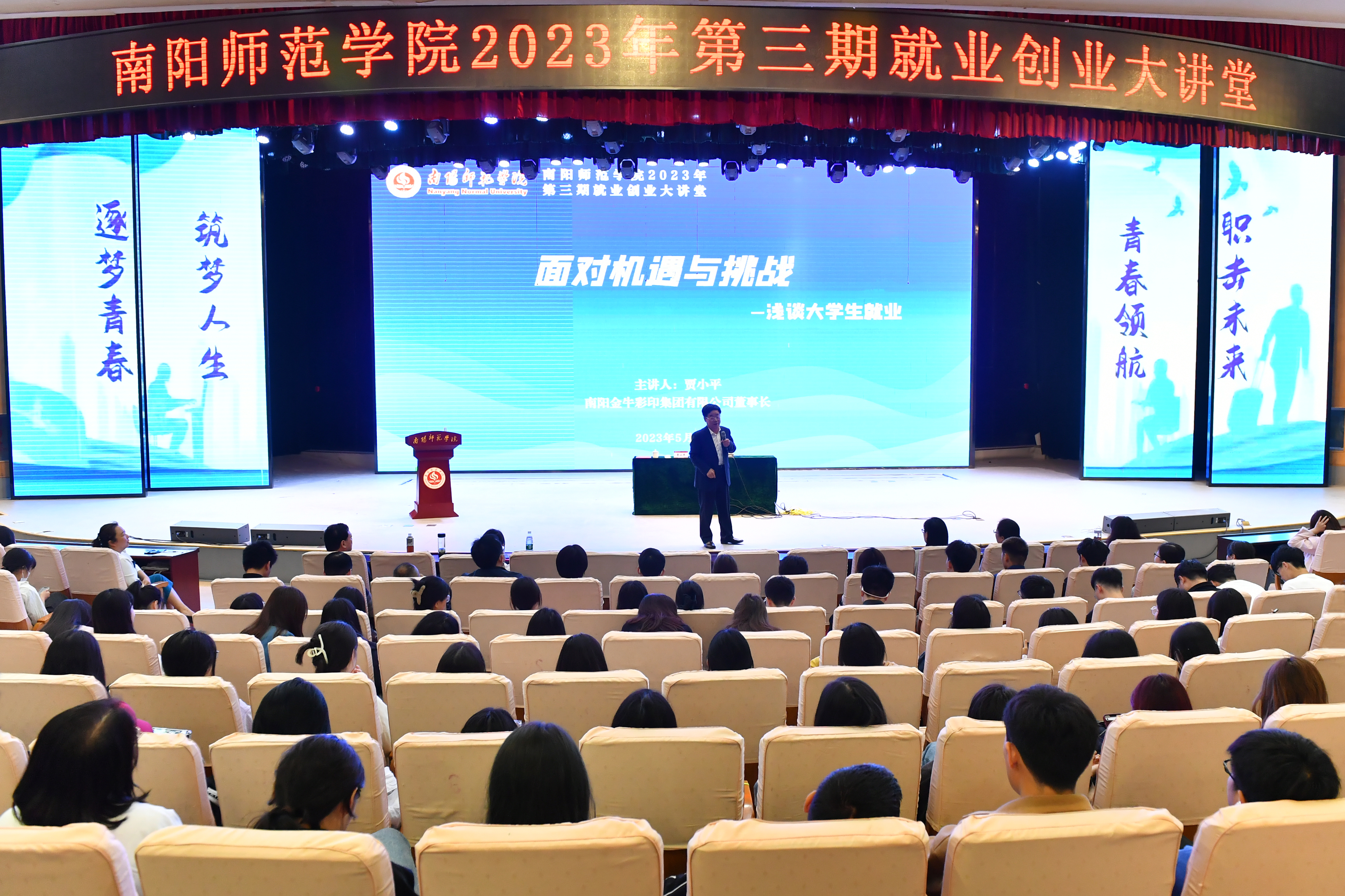 本网讯(程文亮/文 徐佳良/图)5月28日下午,新葡萄官网2023年第三期就业创业大讲堂活动在音乐厅举行。活动邀请南阳金牛彩印集团有限公司董事长贾小平、镇平县电商协会会长满多作报告。校党委副书记谢冰松出席,各学院党委副书记、就业专干和近500名学生代表参加。大讲堂由就业指导与服务中心主任杨洋主持。