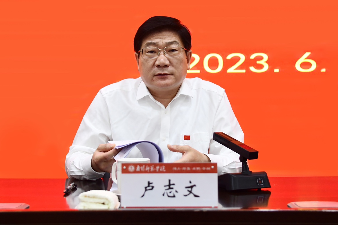 卢志文指出,这次楼阳生书记视察调研南阳是深入学习贯彻落实习近平新时代中国特色社会主义思想和党的二十大精神的生动实践,是学习贯彻习近平总书记视察南阳重要讲话指示精神的重要体现,是大兴调查研究之风,推动主题教育走深走实的进一步彰显。楼阳生书记和省委对南阳高校的高度重视、关心关爱、大力支持,让我们倍感振奋、倍受鼓舞,也深感使命光荣、责任重大。为我们做好当前和今后一个时期各项工作指明了努力方向、带来了重大机遇。卢志文强调,一要提高政治站位,学深悟透楼阳生书记讲话精神。要更加清醒认识到学校肩上的使命之重、责任之重,更加自觉融入国家和省委战略,更加有力服务南阳建设省域副中心城市,推动学校各项事业取得新突破、再上新台阶、作出新贡献。二要坚守立德树人,持续提升人才培养质量。坚持不懈用新时代中国特色社会主义思想铸魂育人。增强专业内涵,全面提升人才培养质量。深化产教融合,推动应用型人才培养模式改革创新。持续扩大研究生培养规模。大力推进毕业生高质量就业。三要聚焦学科科研,凝心聚力提升科技创新水平。凝练学科方向,发展特色骨干学科群。建强学科科研平台,增强创新能力。锚定国家级科研奖励,争创高水平科研成果。四要胸怀“国之大者”,服务国家战略和地方经济社会发展。加强人才科技支撑,服务南水北调。加强成果转化,助推地方产业振兴。建强新型智库,积极咨政建言。五要立足当下工作,确保各项重点任务高质高效推进。扎实开展好主题教育。确保期末校园安全稳定。六要强化干部作风,构建团结和谐、风清气正政治生态。践行好干部标准,下大气力推动工作落实。坚持师生主体地位,下沉一线倾力服务师生。(编审 时树菁)